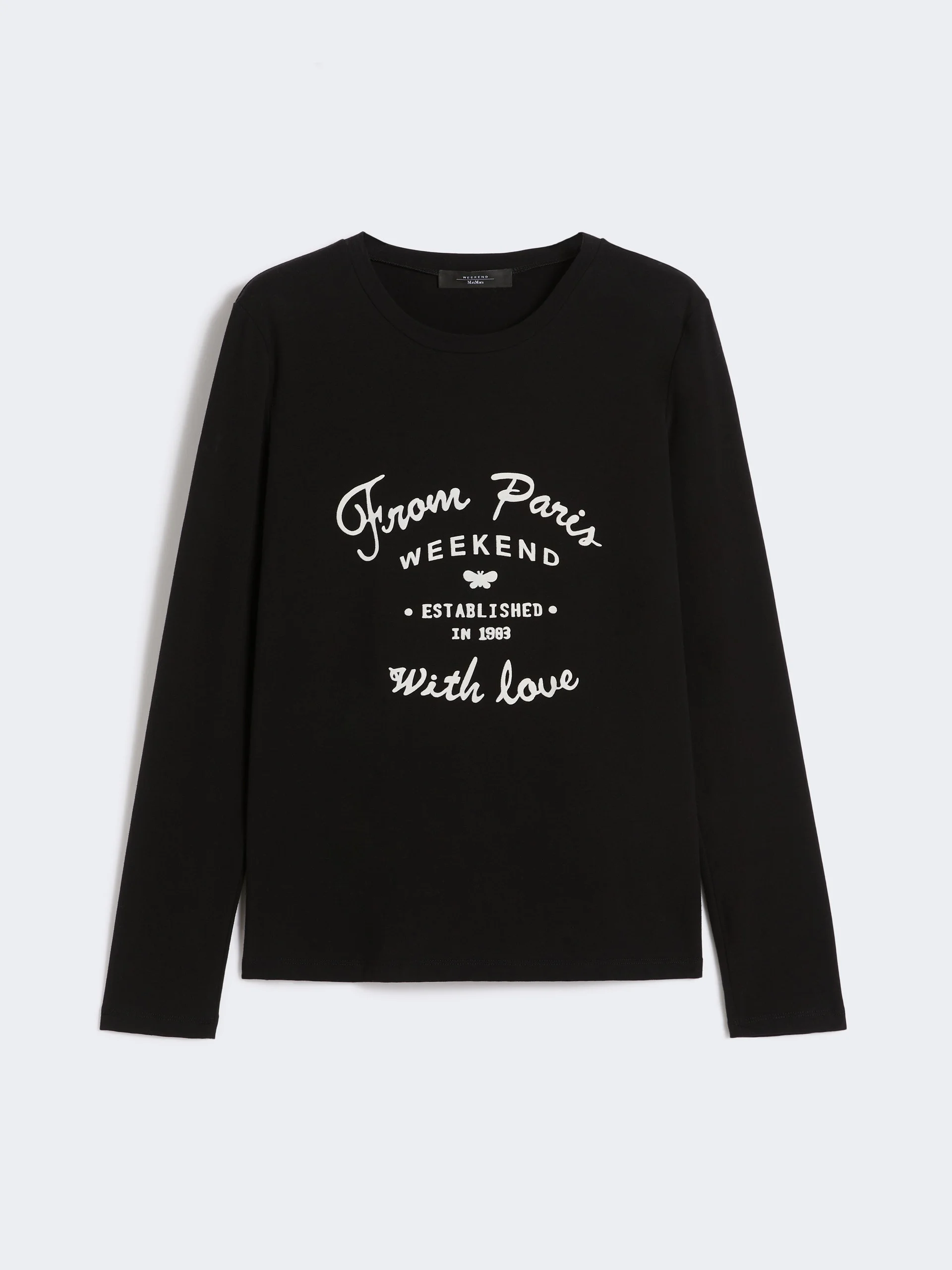DETAILS Long-sleeved T-shirt with collection motif printed on the front. T-shirt in stretch-cotton jersey Figure-hugging Crew neck Set-in sleeves Butterfly logo on the back of the neck COMPOSITION AND CARE 95% cotton, 5% elastane. Hand wash cold (40°c max); do not bleach; do not tumble dry; flat drying in the shade; cool iron; do not dry clean; do not wet clean.; iron with a cloth between.; using neutral detergent.; don’t rub.; turn the articles inside out before washing.; to be ironed on reverse. Distributed by Max Mara S.r.l., registered office in Reggio Emilia (Italy), Via Giulia Maramotti 4, 42124 (IT)
