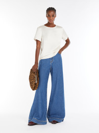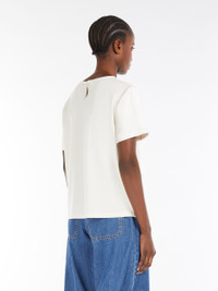 DETAILS Milano-knit technical satin T-shirt with a lyocell jersey back. The straight-fit model boasts a round neckline, short sleeves and keyhole detail at the back. COMPOSITION AND CARE Fabric 100% polyester; back 76% lyocell, 19% polyamide, 5% elastane. Hand wash cold; do not bleach; do not tumble dry; drip line drying in the shade; cool iron; professionally dry clean perchloroethylene - mild process; do not wet clean.; iron with a cloth between.; using neutral detergent.; don’t rub.; turn the articles inside out before washing.; to be ironed on reverse. Distributed by Max Mara S.r.l., registered office in Reggio Emilia (Italy), Via Giulia Maramotti 4, 42124 (IT)