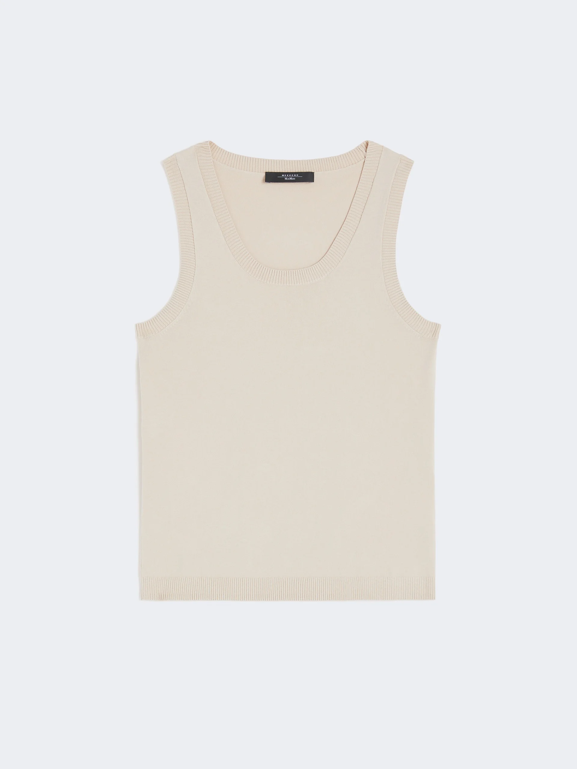 DETAILS Stockinette-stitched top with a regular fit and length. Stretch viscose yarn top Straight fit Crew-neck Sleeveless design Rib-knit trims COMPOSITION AND CARE 77% viscose, 23% polyester. Hand wash cold; do not bleach; do not tumble dry; flat drying in the shade; cool iron; professionally dry clean perchloroethylene - mild process; do not wet clean.; iron with a cloth between.; using neutral detergent. Distributed by Max Mara S.r.l., registered office in Reggio Emilia (Italy), Via Giulia Maramotti 4, 42124 (IT)