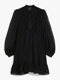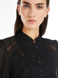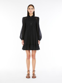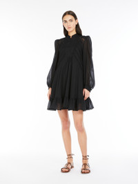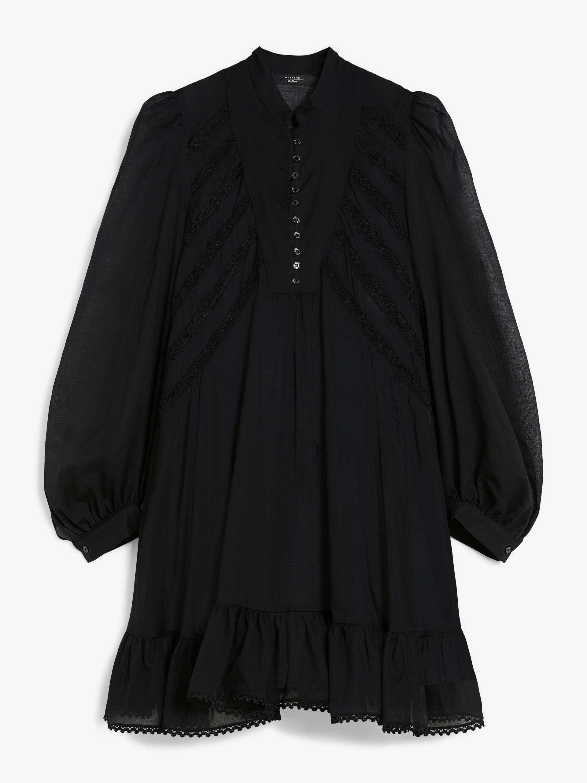 DETAILS Short dress in lightweight pure cotton voile fabric featuring a crew neckline and small raised neck with patterned button detail on the placket. The flared model boasts flounce detail at the hem, in addition to a dainty see-through-look bobbin lace pattern on the front. Embellished with loose-fitting, voluminous sleeves, shirt-style cuffs with button detail at the side, and a removable matching slip. The piece is part of the “Lost in the Garden” capsule, inspired by Riviera gardens and the '70s. Light fabrics, floral details and natural hues for a season that celebrates the free spirit of the Weekend woman. COMPOSITION AND CARE Dress fabric 100% cotton; lace in 100% cotton. Petticoat 100% cotton. Dress: machine wash cold delicate cycle; do not bleach; do not tumble dry; line drying in the shade; cool iron; professionally dry clean perchloroethylene - mild process.; Wash the garment while it is fastened.; Turn the articles inside out before washing.; Contains non-textile parts of animal origin. Petticoat: machine wash cold delicate cycle; do not bleach; do not tumble dry; line drying in the shade; cool iron; professionally dry clean perchloroethylene - mild process.; Do not iron trimmings. Distributed by Max Mara S.r.l., registered office in Reggio Emilia (Italy), Via Giulia Maramotti 4, 42124 (IT)