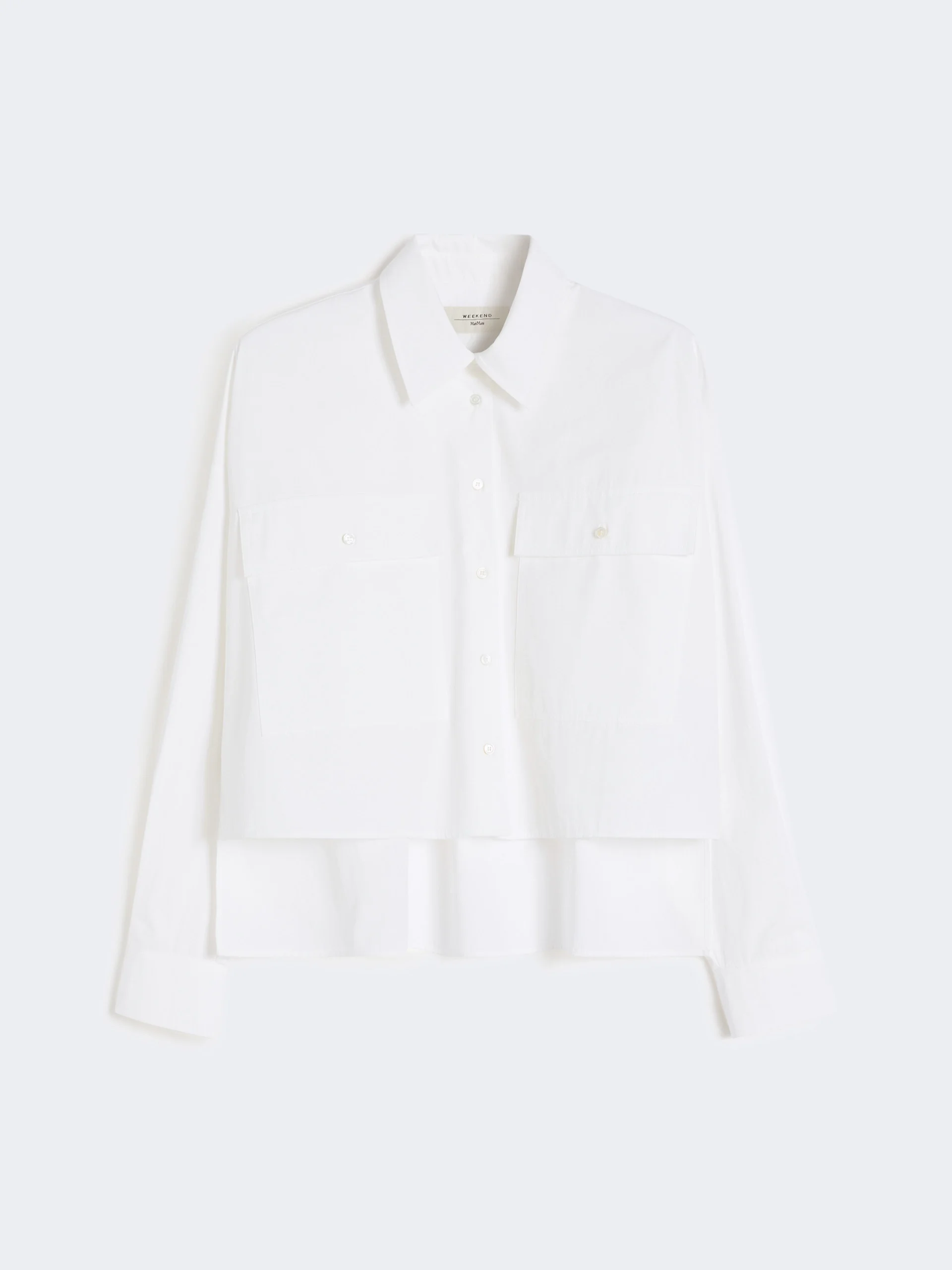 DETAILS Boxy shirt, featuring an asymmetrical hem that is longer at the back. - Shirt in heavy washed cotton poplin fabric - Shirt collar and double cuffs - Drop-shoulder long sleeves - Visible button fastening on the front - Buttoned flap-adorned breast patch pockets COMPOSITION AND CARE 100% cotton. Machine wash cold delicate cycle; do not bleach; do not tumble dry; line drying in the shade; cool iron; professionally dry clean perchloroethylene - mild process.; wash the garment while it is fastened.; turn the articles inside out before washing.; contains non-textile parts of animal origin. Distributed by Max Mara S.r.l., registered office in Reggio Emilia (Italy), Via Giulia Maramotti 4, 42124 (IT) Collection: Weekend Max Mara Product code: 5111076106001 - WKDBRUNO