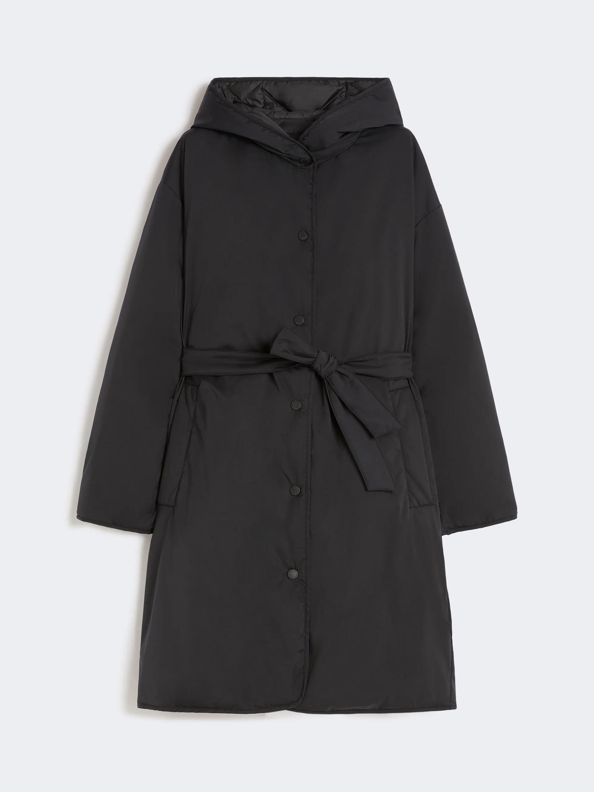 DETAILS Reversible down jacket with robe silhouette and matching belt at the waist. Completely smooth water-repellent twill down jacket Quilted interior with diamond pattern Relaxed fit with dropped shoulders Collar with hood Front fastening with snap buttons Welt pockets on both sides Goose-down padding COMPOSITION AND CARE Fabric 60% polyester, 40% elastomultiester; inner fabric 100% polyester; with quilting virgin down. Machine wash cold delicate cycle; do not bleach; do not tumble dry; line drying in the shade; cool iron; professionally dry clean perchloroethylene - mild process.; home washing: wash in lukewarm water with a gentle wash machine program. use liquid detergent with neuter ph. rinse several times until clear water is discharged. dry away from direct heating. squeeze and stretch to favor volume recovery.; wash the garment while it is fastened.; don’t iron the labels.; protect buttons before washing.; contains non-textile parts of animal origin. Distributed by Max Mara S.r.l., registered office in Reggio Emilia (Italy), Via Giulia Maramotti 4, 42124 (IT)