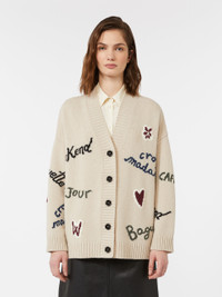 DETAILS Oversized cardigan, embellished with an intarsia knit that creates designs on the front and sleeves. Pure wool yarn cardigan V neck Long sleeves with dropped shoulders Button fastening at the front Ribbed edges COMPOSITION AND CARE 100% virgin wool. Hand wash cold (40°c max); do not bleach; do not tumble dry; flat drying in the shade; cool iron; professionally dry clean perchloroethylene - mild process; do not wet clean.; iron with a cloth between.; using neutral detergent. Distributed by Max Mara S.r.l., registered office in Reggio Emilia (Italy), Via Giulia Maramotti 4, 42124 (IT)