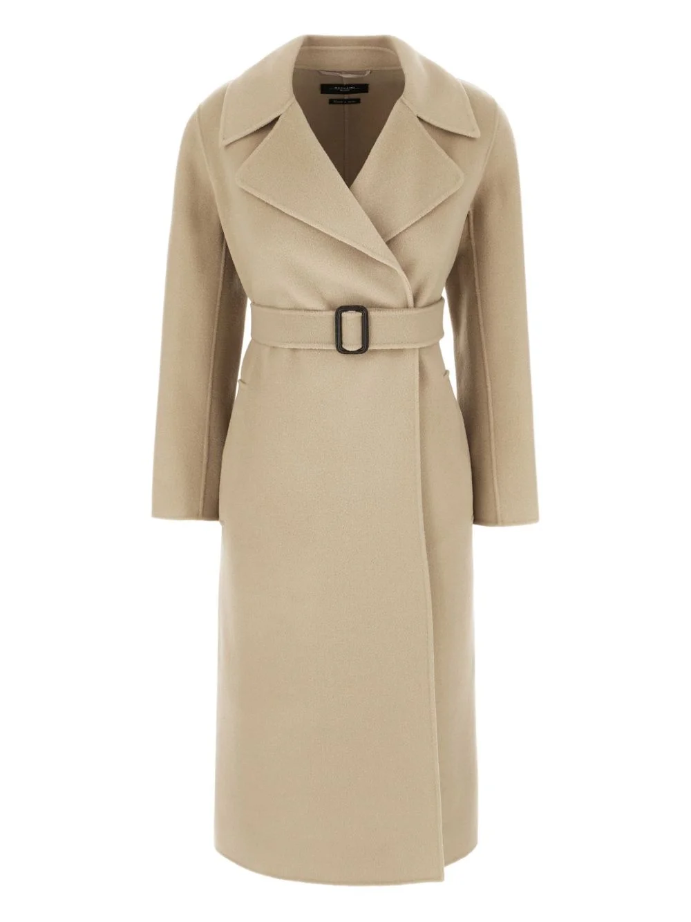 belted double-breasted coat Highlights - Beige - Wool - Self-tie belt - Lapels - Welt pockets Made in Italy Composition Virgin Wool 100% Washing instructions Read Manufacturer Guidelines