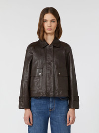 DETAILS Short jacket featuring leather goods-style darts and topstitching. - Jacket in soft washed Nappa leather - Straight fit - Shirt collar - Raglan sleeves with cuff tabs - Concealed button fastening on the front - Large front pockets with branded button detail on the flap - Lined model COMPOSITION AND CARE Style in lamb leather; lining in 100% polyester. Do not wash; do not bleach; do not tumble dry; do not iron; do not dry clean; do not wet clean.; do not wash or dry clean by fabric methods. clean only by leather and fur specialists.; care should be taken with light-coloured garments and accessories because body heat could lead the leather to colour loss and staining. care should be taken when sitting on light-coloured surfaces, especially if damp. avoid lengthy exposure to direct light or heat sources. do not store garments in plastic bags for long periods. Distributed by Max Mara S.r.l., registered office in Reggio Emilia (Italy), Via Giulia Maramotti 4, 42124 (IT) Collection: Weekend Max Mara Product code: 5446025106001 - BERBICE