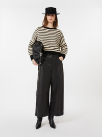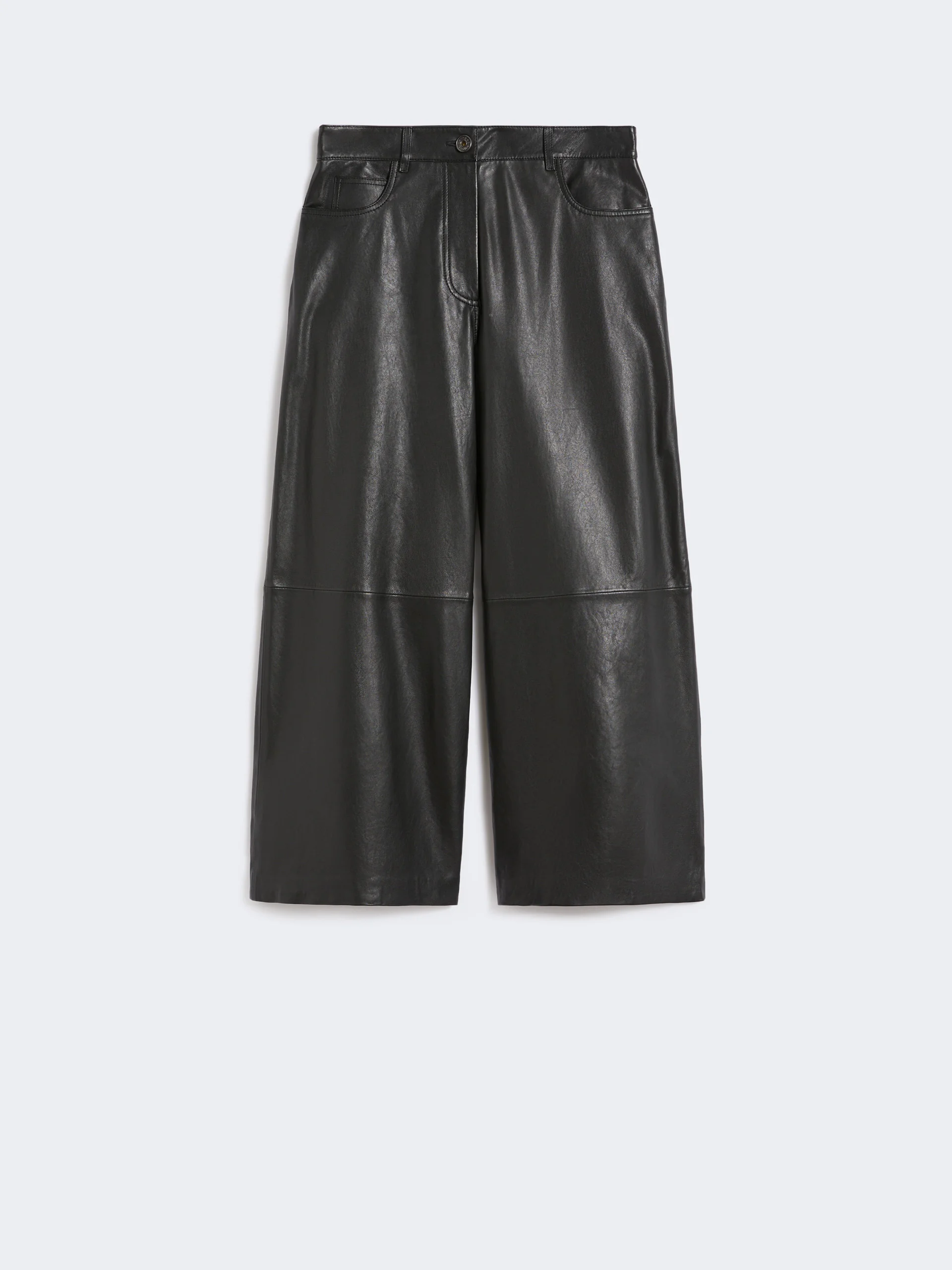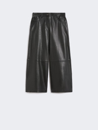 DETAILS Five-pocket trousers cropped above the ankle, finished with leather-style seams and stitching. Soft nappa leather trousers with a worn look Wide, straight leg Concealed zip and button fastening Patch pockets on the back Leather label with embossed logo on the back of the waist Lined COMPOSITION AND CARE Style in lamb leather; lining in 100% polyester. Do not wash; do not bleach; do not tumble dry; do not iron; do not dry clean; do not wet clean.; do not wash or dry clean by fabric methods. clean only by leather and fur specialists.; care should be taken with light-coloured garments and accessories because body heat could lead the leather to colour loss and staining. care should be taken when sitting on light-coloured surfaces, especially if damp. avoid lengthy exposure to direct light or heat sources. do not store garments in plastic bags for long periods. Distributed by Max Mara S.r.l., registered office in Reggio Emilia (Italy), Via Giulia Maramotti 4, 42124 (IT)