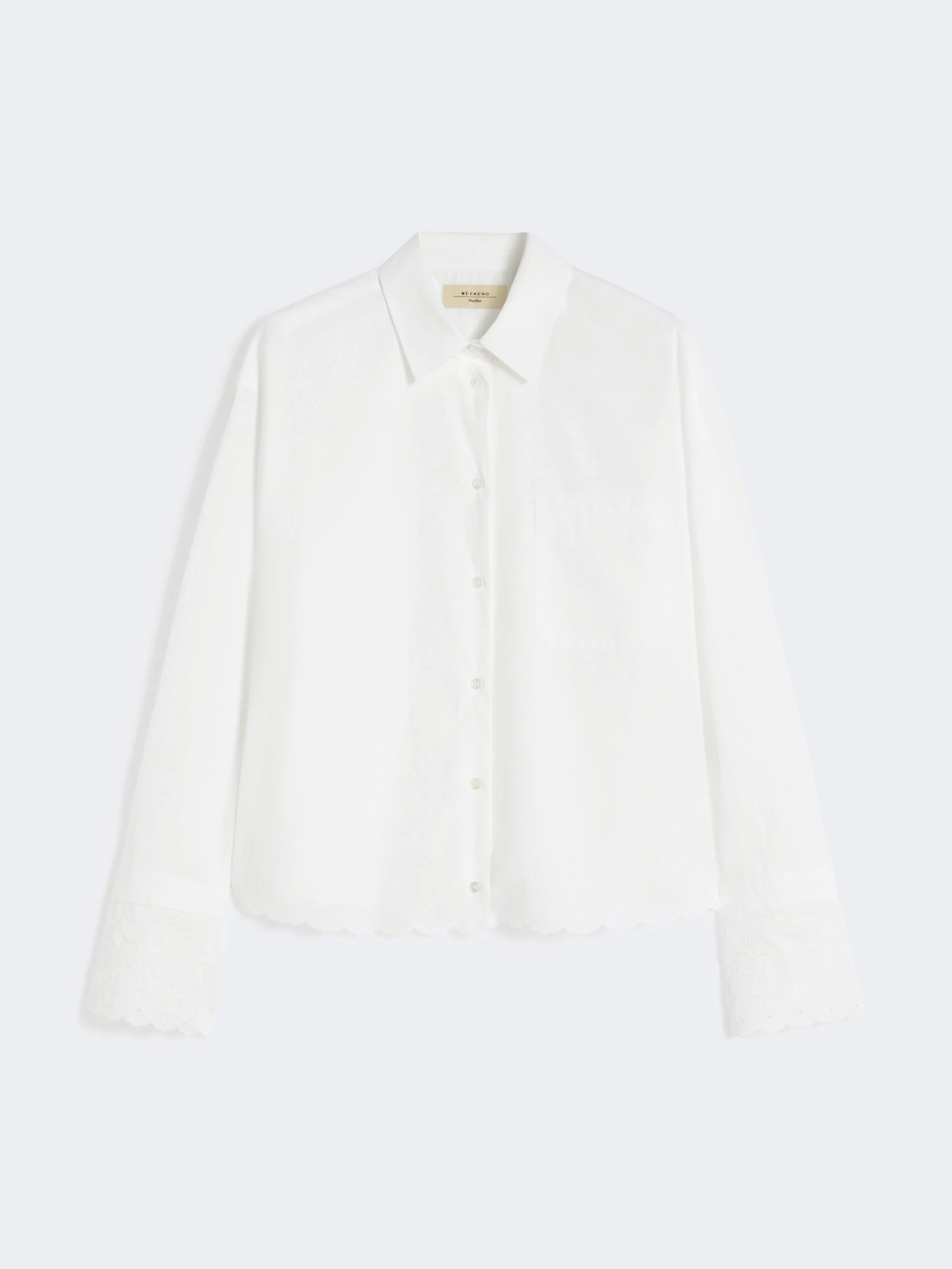 DETAILS Classic shirt featuring lace details and small embroidered butterfly logo detail on the side. - Shirt in pure cotton poplin fabric - Straight fit - Scalloped broderie anglaise lace shirt collar and long cuffs - Mother-of-pearl button fastening - Patch breast pocket - Darted rear yoke and central pleat detail on the back - Scalloped-edge rounded hem COMPOSITION AND CARE Fabric 100% cotton; embroidery thread 100% polyester. Hand wash cold (40°c max); do not bleach; do not tumble dry; line drying in the shade; cool iron; professionally dry clean perchloroethylene - mild process; do not wet clean.; wash the garment while it is fastened.; turn the articles inside out before washing.; contains non-textile parts of animal origin. Distributed by Max Mara S.r.l., registered office in Reggio Emilia (Italy), Via Giulia Maramotti 4, 42124 (IT) Collection: Weekend Max Mara Product code: 5111026106004 - WKDNEUTRO