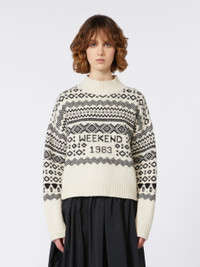 DETAILS Soft lights, winter settings and new style rituals: The Weekend Max Mara Holiday Edit FW25 explores the magical festive season. Oversized jumper, embellished with a Nordic-inspired jacquard knit. Knit jumper made of a wool and alpaca blend Boxy fit Stand collar Long sleeves with dropped shoulders Ribbed trim COMPOSITION AND CARE Upper part 41% wool, 22% polyamide, 15% acrylic, 14% alpaca, 7% viscose, 1% elastane; lower part 55% wool, 33% polyamide, 11% viscose, 1% elastane. Hand wash cold (40°c max); do not bleach; do not tumble dry; flat drying in the shade; cool iron; professionally dry clean perchloroethylene - mild process; do not wet clean.; iron with a cloth between.; using neutral detergent. Distributed by Max Mara S.r.l., registered office in Reggio Emilia (Italy), Via Giulia Maramotti 4, 42124 (IT)