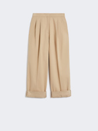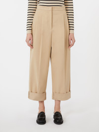 DETAILS Relaxed fit trousers featuring a wide leg silhouette with high cuffs at the hem. Comfort cotton gabardine trousers Warm, soft finish Wide leg with double pleat on the front Fastening with a wide waistband tab, zip fly and small hook Side inset pockets Welt pockets with button at the back Trouser crease COMPOSITION AND CARE 97% cotton, 3% elastane. Machine wash cold delicate cycle; do not bleach; do not tumble dry; line drying in the shade; cool iron; professionally dry clean perchloroethylene - mild process. Distributed by Max Mara S.r.l., registered office in Reggio Emilia (Italy), Via Giulia Maramotti 4, 42124 (IT)