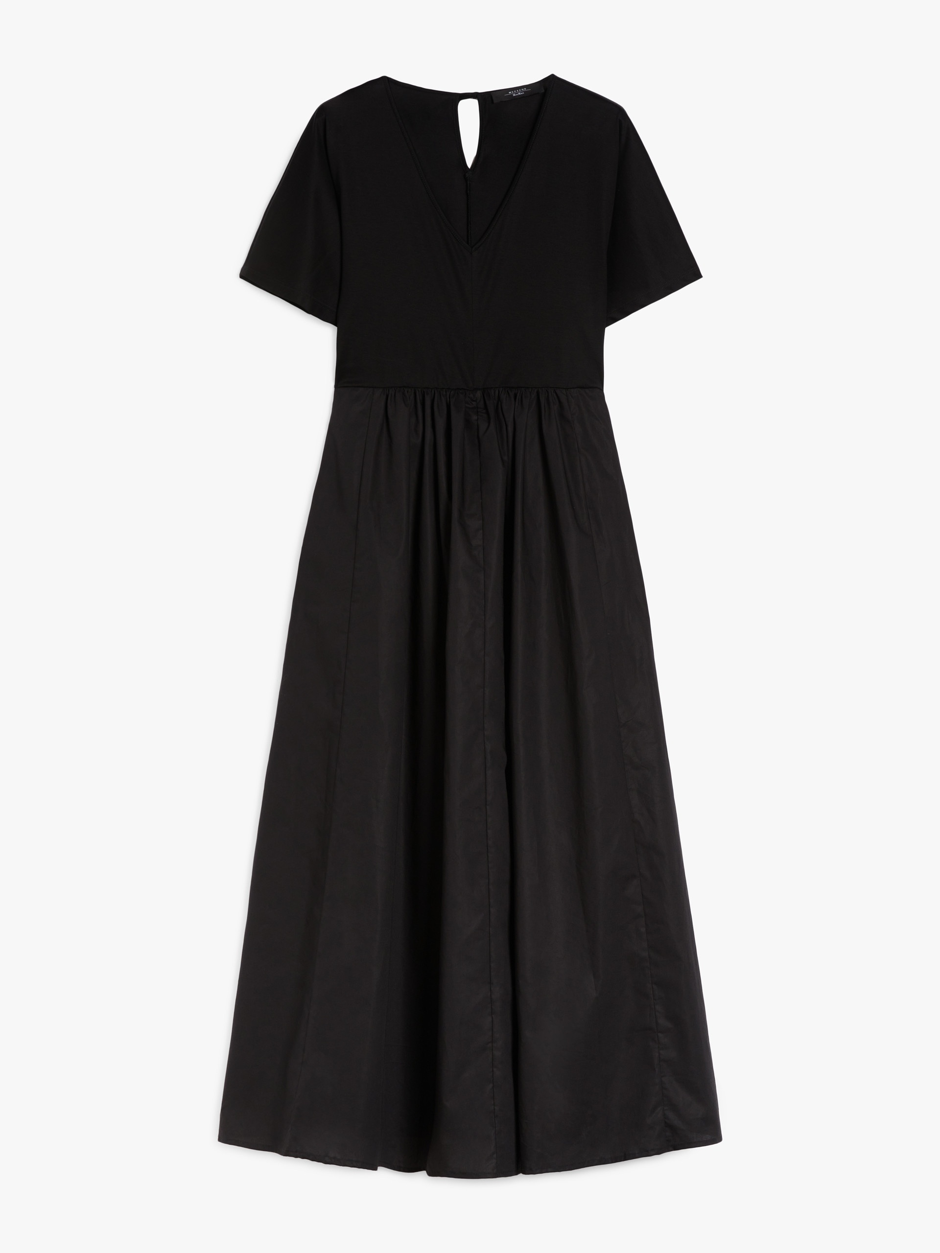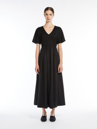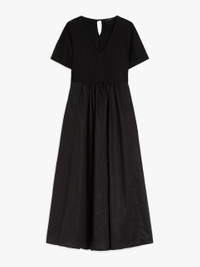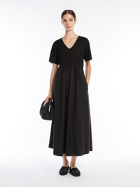 DETAILS Long, full dress featuring a cotton jersey top and a cotton poplin skirt with decorative vertical seams and gathering at the waist. The style features a wide V neck, short kimono sleeves, side inset pockets and a teardrop fastening at the back with ties. COMPOSITION AND CARE Upper part 100% cotton; lower part 100% cotton; - exclusive of embroideries. Machine wash cold delicate cycle; do not bleach; do not tumble dry; flat drying in the shade; cool iron; professionally dry clean perchloroethylene - mild process; professional wet cleaning - very mild process.; iron with a cloth between.; using neutral detergent.; turn the articles inside out before washing.; to be ironed on reverse. Distributed by Max Mara S.r.l., registered office in Reggio Emilia (Italy), Via Giulia Maramotti 4, 42124 (IT)