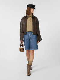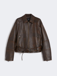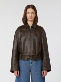 DETAILS Short biker-style jacket: rear yoke, elbow dart detail and zipped cuffs. - Jacket in aged-look soft Nappa leather - Shirt collar and drop-shoulder long sleeves - Metal zip fastening on the front - Zipped side pockets - Metal buckle and eyelet-adorned belt at the hem - Lined model COMPOSITION AND CARE Style in lamb leather; lining in 100% polyester. Do not wash; do not bleach; do not tumble dry; do not iron; do not dry clean; do not wet clean.; do not wash or dry clean by fabric methods. clean only by leather and fur specialists.; protect the metal parts before washing.; care should be taken with light-coloured garments and accessories because body heat could lead the leather to colour loss and staining. care should be taken when sitting on light-coloured surfaces, especially if damp. avoid lengthy exposure to direct light or heat sources. do not store garments in plastic bags for long periods. Distributed by Max Mara S.r.l., registered office in Reggio Emilia (Italy), Via Giulia Maramotti 4, 42124 (IT) Collection: Weekend Max Mara Product code: 5446015106002 - EGIZIO