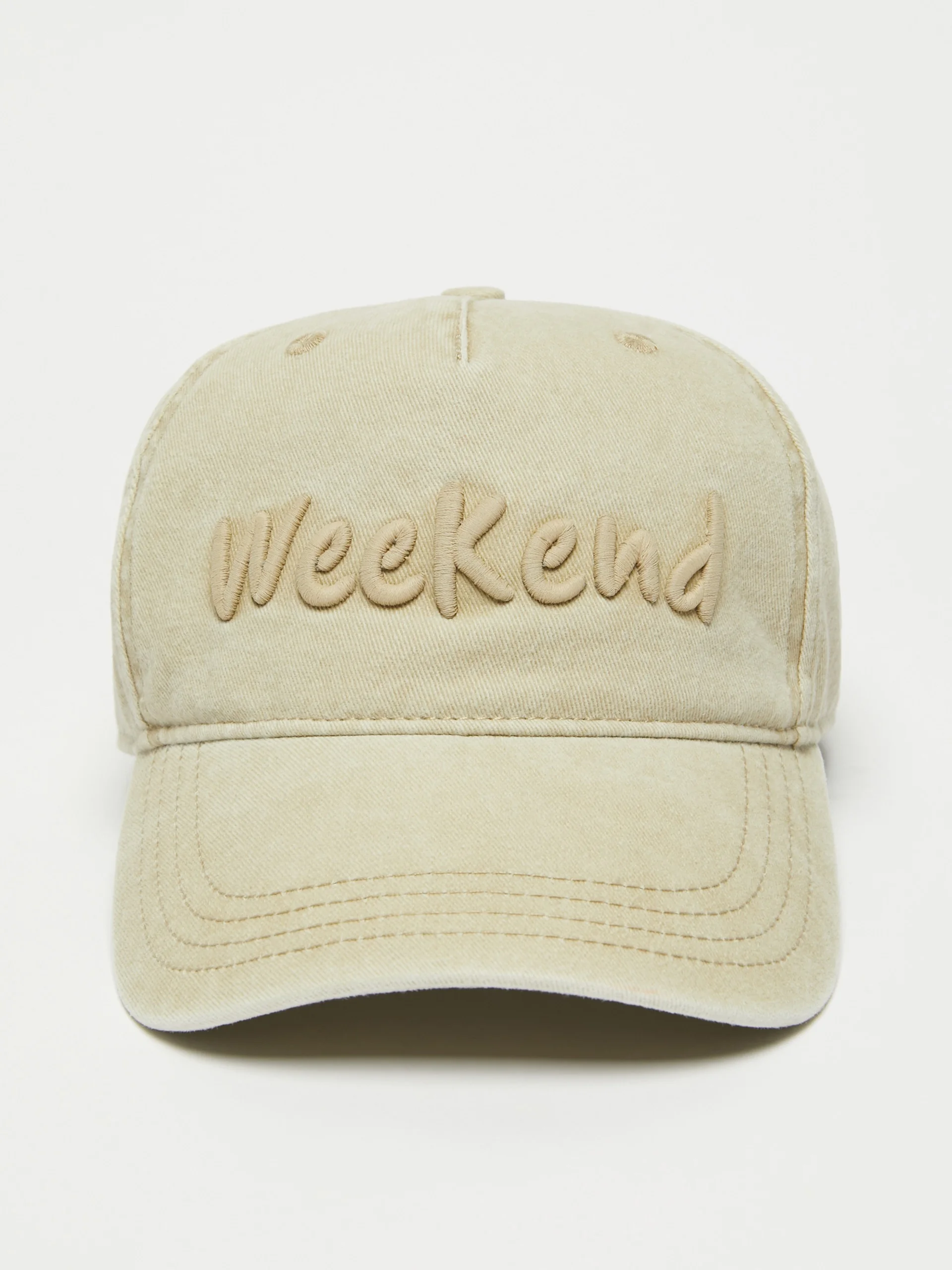DETAILS Baseball cap featuring a semi-rigid peak and branded Weekend lettering detail on the front. Cap in faded-look pure cotton canvas Cotton ribbon inner trim Topstitching detail on the peak Adjustable strap at the back COMPOSITION AND CARE Fabric 100% cotton; swearband 100% cotton. Hand wash cold; do not bleach; do not tumble dry; line drying in the shade; do not iron; do not dry clean; do not wet clean. Distributed by Max Mara S.r.l., registered office in Reggio Emilia (Italy), Via Giulia Maramotti 4, 42124 (IT)