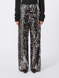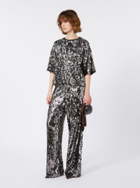 DETAILS Soft lights, winter settings and new style rituals: The Weekend Max Mara Holiday Edit FW25 explores the magical festive season. Trousers with a loose silhouette, embellished with an all-over embroidery featuring sequins of different sizes, creating a play of movement and mirror reflections. Embroidered tulle trousers Wide leg Concealed zip fastening at the side Lined COMPOSITION AND CARE Jersey fabric 95% polyester, 5% elastane; joining thread 100% polyester; lining 100% polyester; - exclusive of decoration. Hand wash cold (40°c max); do not bleach; do not tumble dry; flat drying in the shade; do not iron; do not dry clean; do not wet clean.; using neutral detergent.; don’t rub.; turn the articles inside out before washing. Distributed by Max Mara S.r.l., registered office in Reggio Emilia (Italy), Via Giulia Maramotti 4, 42124 (IT)