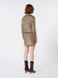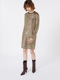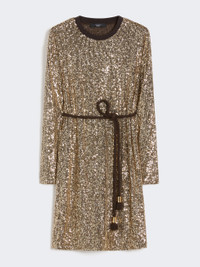 DETAILS Soft lights, winter settings and new style rituals: The Weekend Max Mara Holiday Edit FW25 explores the magical festive season. Short T-shirt-style dress with matching removable belt in a woven tubular fabric with tassels and metal ends. Tulle dress entirely embroidered with micro sequins Straight cut Crew neck Long sleeves with dropped shoulders Neckline and cuffs in a ribbed jersey finish Lined COMPOSITION AND CARE Jersey dress jersey fabric 95% polyester, 5% elastane; joining thread 100% polyester; lining 95% polyester, 5% elastane; - exclusive of decoration, exclusive of accessories. Belt 65% polyester, 35% cotton. Jersey dress: hand wash cold (40°c max); do not bleach; do not tumble dry; flat drying in the shade; do not iron; do not dry clean; do not wet clean.; Before cleaning the style remove the accessories.; Using neutral detergent.; Don’t rub.; Remove the belt before washing.; Turn the articles inside out before washing. Belt: do not wash; do not bleach; do not tumble dry; do not iron; do not dry clean; do not wet clean. Distributed by Max Mara S.r.l., registered office in Reggio Emilia (Italy), Via Giulia Maramotti 4, 42124 (IT)