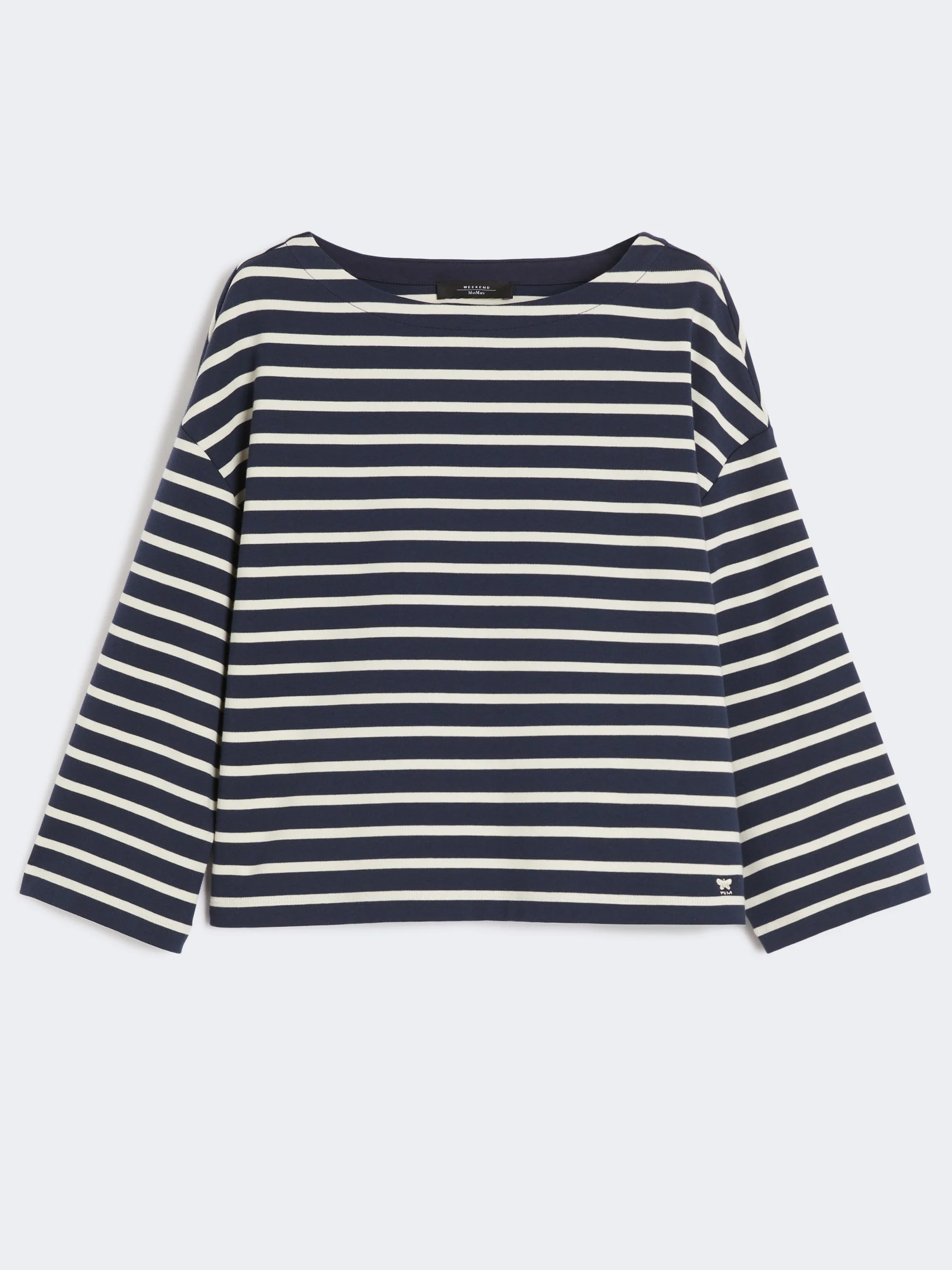 DETAILS Boxy-fit boat-neck T-shirt. Main fabric with cotton fibers, grown and processed according to organic farming systems T-shirt in pure cotton interlock jersey fabric Drop-shoulder long sleeves Small embroidered butterfly logo detail on the side COMPOSITION AND CARE Jersey fabric 100% cotton; - exclusive of embroideries. Machine wash cold delicate cycle; do not bleach; do not tumble dry; flat drying in the shade; cool iron; professionally dry clean perchloroethylene - mild process; professional wet cleaning - very mild process.; iron with a cloth between.; using neutral detergent. Distributed by Max Mara S.r.l., registered office in Reggio Emilia (Italy), Via Giulia Maramotti 4, 42124 (IT)
