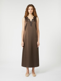 DETAILS Fluid-fit long dress with a flared skirt. Satin dress V-neckline with a floral broderie anglaise lace trim Sleeveless design Concealed zip fastening at the side Wide shoulder straps Unlined model COMPOSITION AND CARE 100% polyester. Hand wash cold (40°c max); do not bleach; do not tumble dry; line drying in the shade; cool iron; professionally dry clean perchloroethylene - mild process; do not wet clean.; do not iron embroidery. Distributed by Max Mara S.r.l., registered office in Reggio Emilia (Italy), Via Giulia Maramotti 4, 42124 (IT)