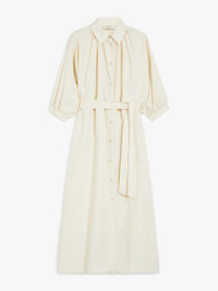DETAILS Long, pure cotton canvas shirt dress. The style features a classic shirt collar with a gathered motif on the front and back and wide three-quarter length set-in balloon sleeves with cuffs at the hem. The matching belt accentuates the feminine silhouette. Finished with side slits and inset side pockets. Front closure with visible buttons along the entire length. COMPOSITION AND CARE 100% cotton. Machine wash cold delicate cycle; do not bleach; do not tumble dry; line drying in the shade; cool iron; professionally dry clean perchloroethylene - mild process.; wash the garment while it is fastened.; turn the articles inside out before washing.; contains non-textile parts of animal origin. Distributed by Max Mara S.r.l., registered office in Reggio Emilia (Italy), Via Giulia Maramotti 4, 42124 (IT)