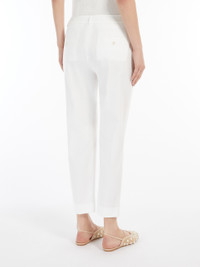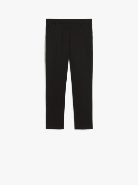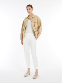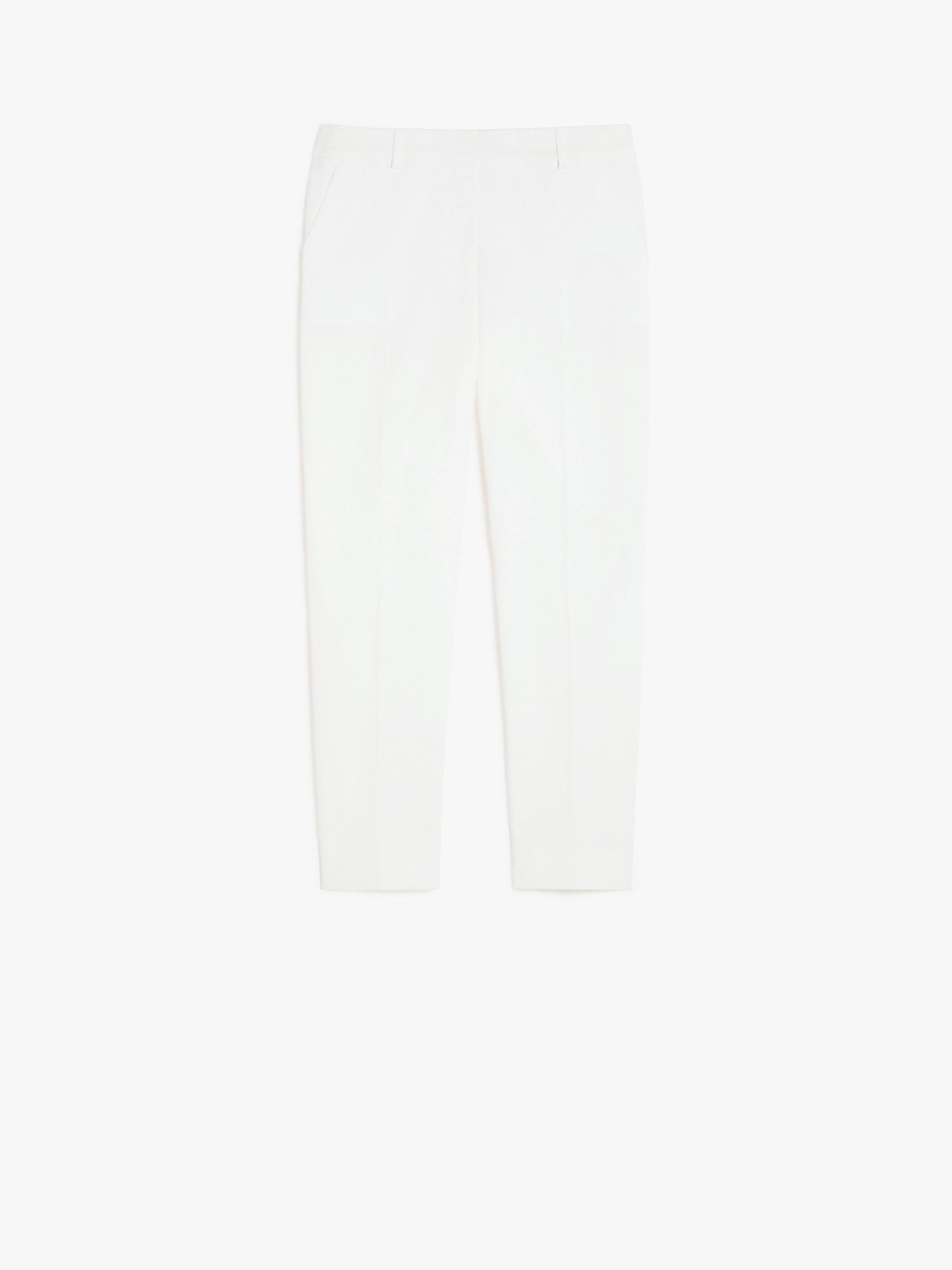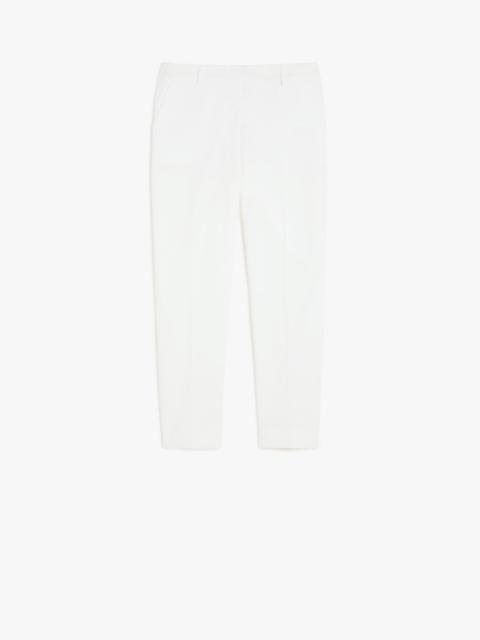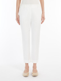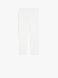DETAILS Cigarette trousers in stretch cotton gabardine, featuring a slim-fit silhouette cropped at the ankle. The style has a trouser crease, belt loops, slant pockets at the sides and back welt pockets. Fastening with high waistband tab, zip fly and small hook. COMPOSITION AND CARE 97% cotton, 3% elastane. Machine wash cold delicate cycle; do not bleach; do not tumble dry; line drying in the shade; cool iron; professionally dry clean perchloroethylene - mild process. Distributed by Max Mara S.r.l., registered office in Reggio Emilia (Italy), Via Giulia Maramotti 4, 42124 (IT)