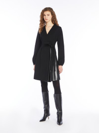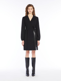DETAILS Short fit-and-flare dress in Milano rib-knit soft viscose-blend jersey fabric. The unlined model boasts a crossover design, V-neckline and elasticated cuff-adorned long sleeves. Embellished with a coated fabric insert on the left side of the skirt, in addition to a matching belt at the waist. COMPOSITION AND CARE Jersey fabric 1 69% viscose, 27% polyamide, 4% elastane; jersey fabric 2 100% polyester; layer polyurethanic resin. Hand wash cold; do not bleach; do not tumble dry; flat drying in the shade; cool iron; do not dry clean; do not wet clean.; iron with a cloth between.; using neutral detergent.; turn the articles inside out before washing.; to be ironed on reverse. Distributed by Max Mara S.r.l., registered office in Reggio Emilia (Italy), Via Giulia Maramotti 4, 42124 (IT)