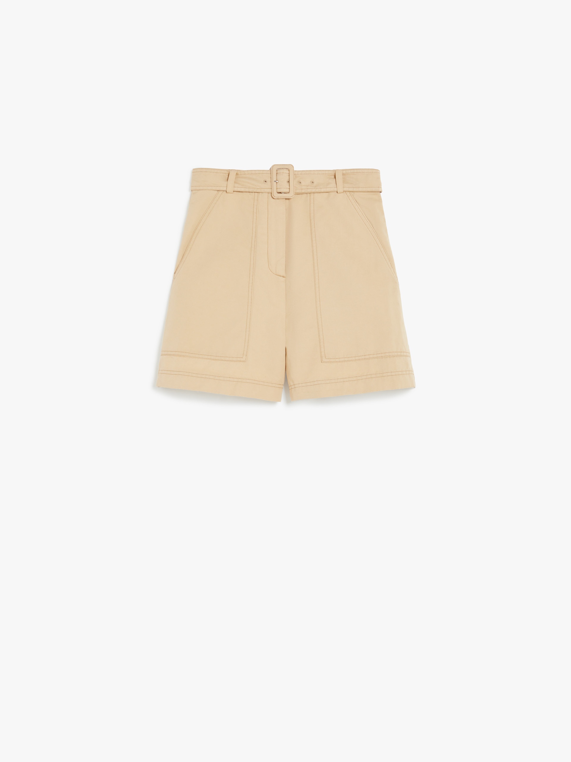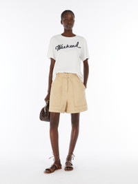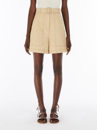 DETAILS Bermuda trousers in cotton and linen, featuring a slightly flared silhouette and a matching belt to accentuate the waist. The style is completed by large cargo pockets on the front and patch pockets on the back. Concealed zip and button fastening. COMPOSITION AND CARE 78% cotton, 22% flaxlinen. Machine wash cold delicate cycle; do not bleach; do not tumble dry; line drying in the shade; cool iron; professionally dry clean perchloroethylene - mild process.; protect the buckle before washing. Distributed by Max Mara S.r.l., registered office in Reggio Emilia (Italy), Via Giulia Maramotti 4, 42124 (IT)