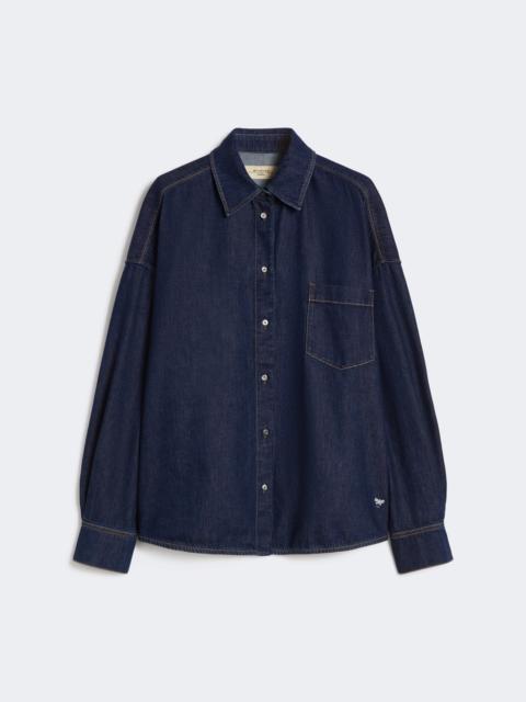 DETAILS Oversized shirt with classic tobacco-coloured denim-style stitching and patch pocket on the left chest. - Main fabric with cotton fibers, grown and processed according to organic farming systems - "Nano bubble" treatment technology - Pure cotton denim shirt - Shirt collar and double cuffs - Long sleeves with dropped shoulders - Mother-of-pearl button fastening on the front - Darted rear yoke and butterfly embroidery at the side COMPOSITION AND CARE Fabric 100% cotton; - exclusive of embroideries. Machine wash cold delicate cycle; do not bleach; do not tumble dry; line drying in the shade; cool iron; professionally dry clean perchloroethylene - mild process.; wash the garment while it is fastened.; turn the articles inside out before washing.; take care when wearing light-coloured clothes or accessories because, with the heat of the body, the denim fabric that comes into contact with them may bleed and stain. be careful while sitting on pale colored surfaces, especially if wet. wash denim items separately and always turned inside out. hang the garment turned inside out by avoiding to expose it to direct sunlight. avoid removing isolated stains.; contains non-textile parts of animal origin. Distributed by Max Mara S.r.l., registered office in Reggio Emilia (Italy), Via Giulia Maramotti 4, 42124 (IT) Collection: Weekend Max Mara Product code: 5111016106001 - WKDFOGGIA