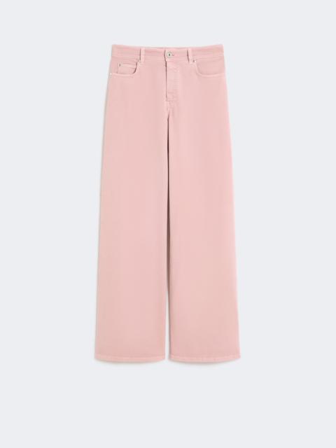 DETAILS Long trousers featuring a five-pocket construction with patch pockets on the back. - Trousers in garment-dyed stretch cotton drill fabric - Wide fit with a straight leg - Fly-covered zip and metal tack button fastening - Metal rivets and belt loops at the waist COMPOSITION AND CARE 98% cotton, 2% elastane. Machine wash cold delicate cycle; do not bleach; do not tumble dry; line drying in the shade; cool iron; do not dry clean.; wash the garment while it is fastened.; wash separately.; don’t iron the labels.; turn the articles inside out before washing.; dyed article. the unevennes of the dye and the pressing form its characteristic.; this item may leave colour stains on brightly-coloured garments.; contains non-textile parts of animal origin. Distributed by Max Mara S.r.l., registered office in Reggio Emilia (Italy), Via Giulia Maramotti 4, 42124 (IT) Collection: Weekend Max Mara Product code: 5131056106012 - WKDMEDINA