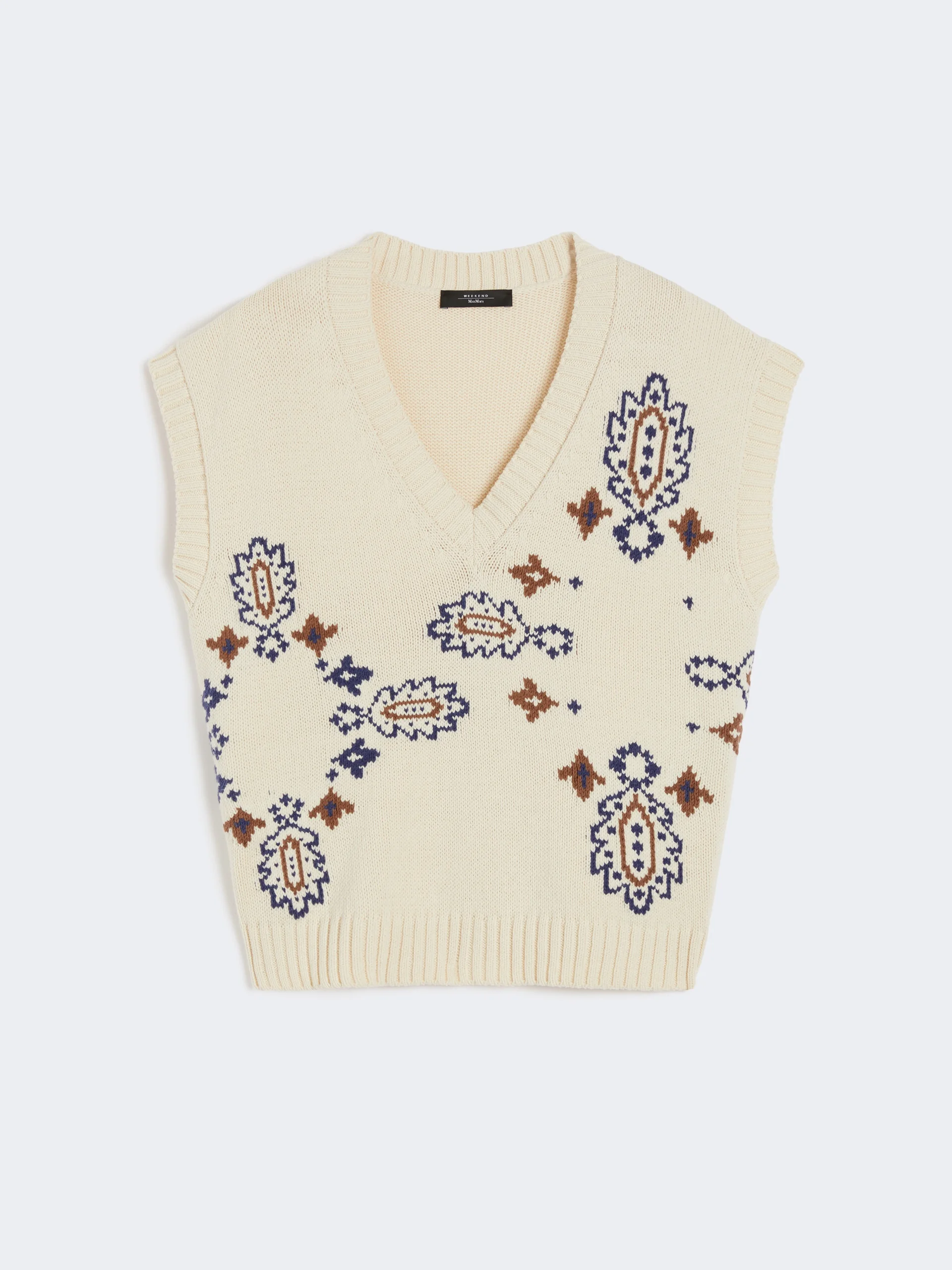 DETAILS Gilet adorned with inlaid detail on the front and rib-knit trims - Cotton-blend yarn gilet - Boxy fit - V-neck - Regular length COMPOSITION AND CARE 60% cotton, 40% acrylic. Hand wash cold (40°c max); do not bleach; do not tumble dry; flat drying in the shade; cool iron; professionally dry clean perchloroethylene - mild process; do not wet clean.; iron with a cloth between.; using neutral detergent. Distributed by Max Mara S.r.l., registered office in Reggio Emilia (Italy), Via Giulia Maramotti 4, 42124 (IT)
