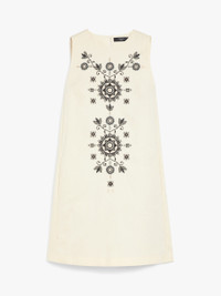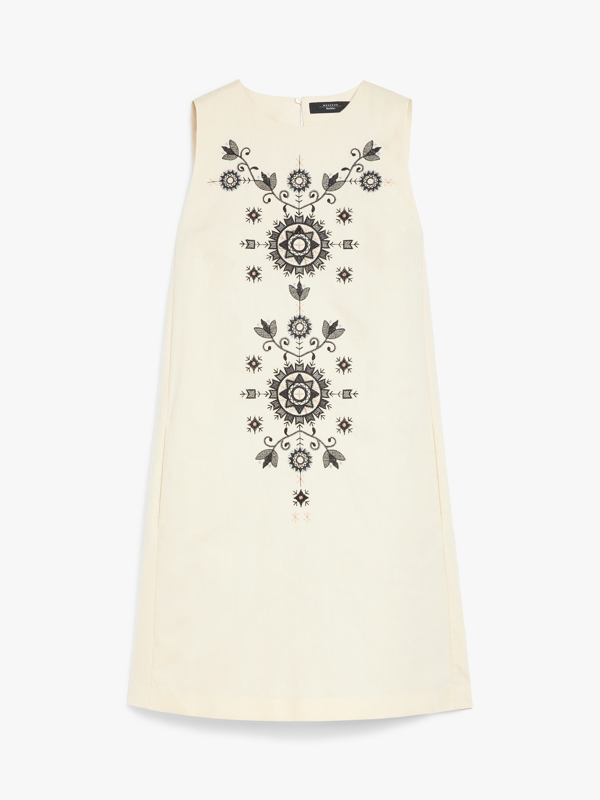 DETAILS Short sleeveless dress in cotton and linen canvas, embellished with contrasting decorative embroidery on the front. Lined style with a flared A-line silhouette, inset side pockets and a round neckline with a teardrop motif on the back. COMPOSITION AND CARE Fabric 75% cotton, 25% flaxlinen; lining 100% cotton; embroidery thread 100% polyester. Hand wash cold; do not bleach; do not tumble dry; line drying in the shade; cool iron; professionally dry clean perchloroethylene - mild process; do not wet clean.; wash the garment while it is fastened.; do not iron embroidery.; contains non-textile parts of animal origin. Distributed by Max Mara S.r.l., registered office in Reggio Emilia (Italy), Via Giulia Maramotti 4, 42124 (IT)