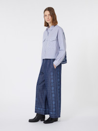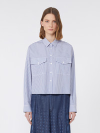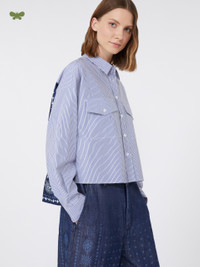 DETAILS Short shirt featuring a contrasting printed technical twill insert at the back. Main fabric with cotton fibers, grown and processed according to organic farming systems Shirt in garment-washed heavy cotton canvas Classic pointed collar Drop-shoulder sleeves with double cuffs Visible button fastening on the front Buttoned flap-adorned patch breast pockets High-low hem design with side slits COMPOSITION AND CARE Fabric 100% cotton; bottom part, back 100% polyester. Machine wash cold delicate cycle; do not bleach; do not tumble dry; line drying in the shade; cool iron; professionally dry clean perchloroethylene - mild process.; wash the garment while it is fastened.; turn the articles inside out before washing.; contains non-textile parts of animal origin. Distributed by Max Mara S.r.l., registered office in Reggio Emilia (Italy), Via Giulia Maramotti 4, 42124 (IT)