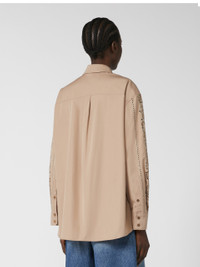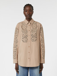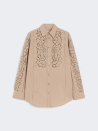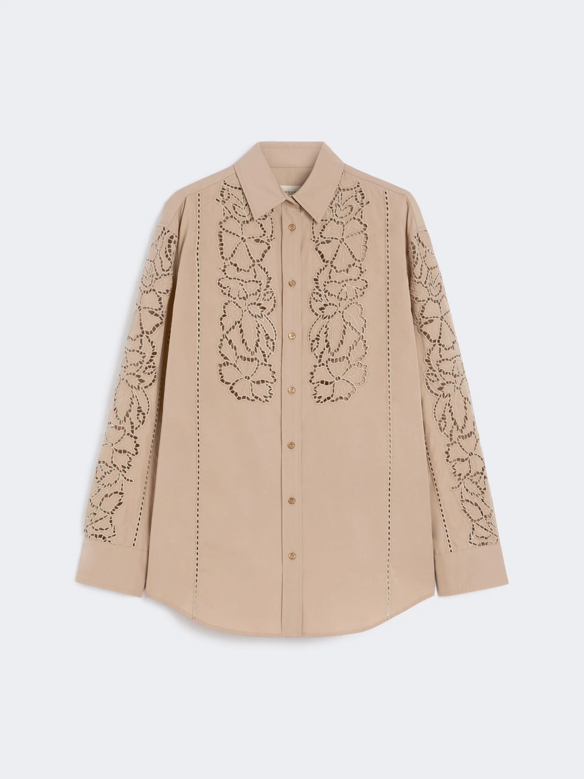DETAILS Relaxed-fit shirt featuring floral-patterned broderie anglaise detail. Pure cotton poplin shirt Straight fit with a slightly rounded hem Classic pointed collar Long sleeves with dropped shoulders and double button detail on the cuffs Visible button fastening on the front Pleated darted rear yoke COMPOSITION AND CARE Fabric 100% cotton; embroidery thread 100% polyester. Hand wash cold (40°c max); do not bleach; do not tumble dry; line drying in the shade; cool iron; professionally dry clean perchloroethylene - mild process; do not wet clean.; wash the garment while it is fastened.; do not iron embroidery.; turn the articles inside out before washing.; contains non-textile parts of animal origin. Distributed by Max Mara S.r.l., registered office in Reggio Emilia (Italy), Via Giulia Maramotti 4, 42124 (IT)