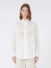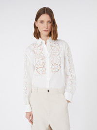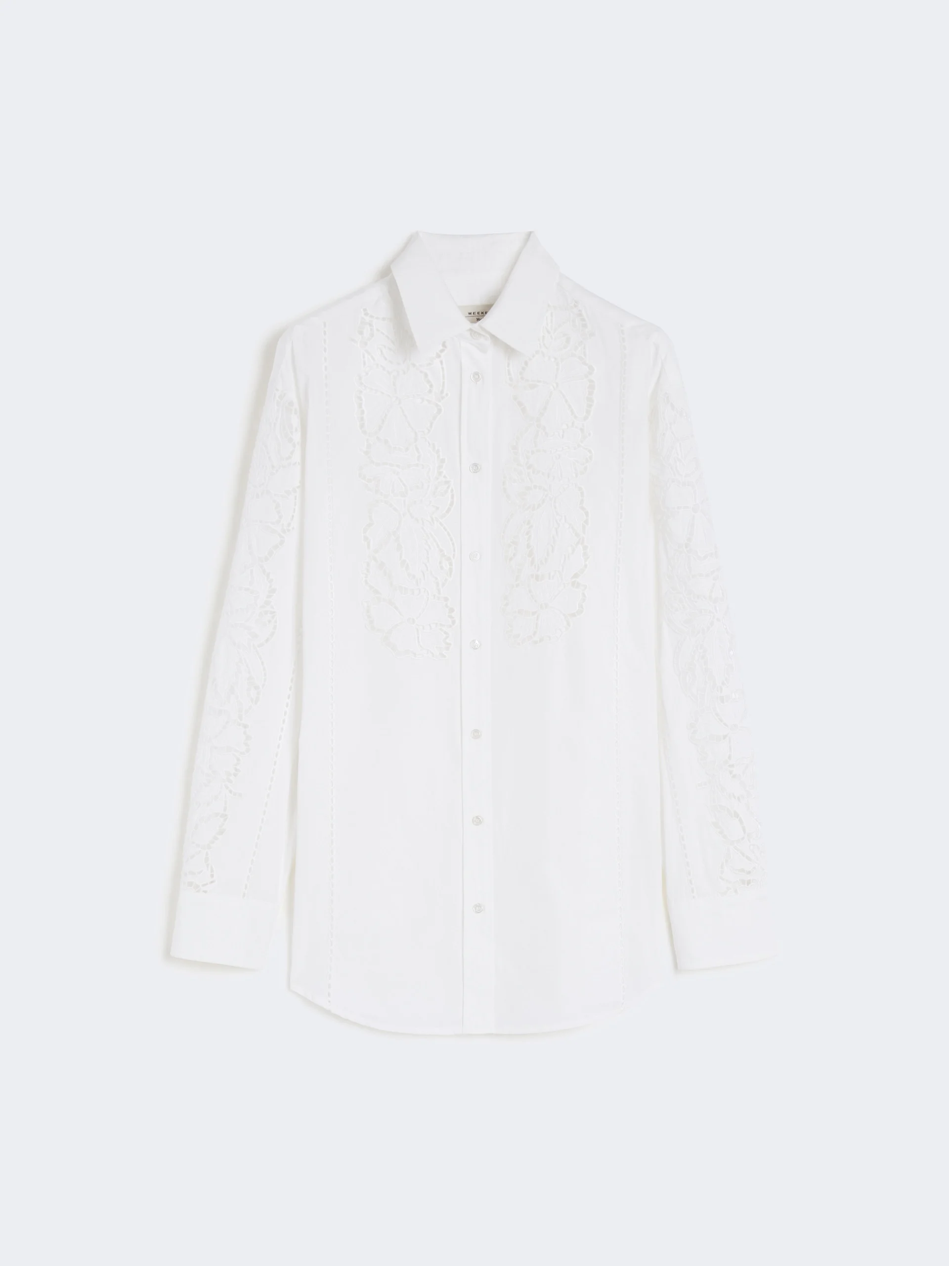 DETAILS Relaxed-fit shirt featuring floral-patterned broderie anglaise detail. Pure cotton poplin shirt Straight fit with a slightly rounded hem Classic pointed collar Long sleeves with dropped shoulders and double button detail on the cuffs Visible button fastening on the front Pleated darted rear yoke COMPOSITION AND CARE Fabric 100% cotton; embroidery thread 100% polyester. Hand wash cold (40°c max); do not bleach; do not tumble dry; line drying in the shade; cool iron; professionally dry clean perchloroethylene - mild process; do not wet clean.; wash the garment while it is fastened.; do not iron embroidery.; turn the articles inside out before washing.; contains non-textile parts of animal origin. Distributed by Max Mara S.r.l., registered office in Reggio Emilia (Italy), Via Giulia Maramotti 4, 42124 (IT)