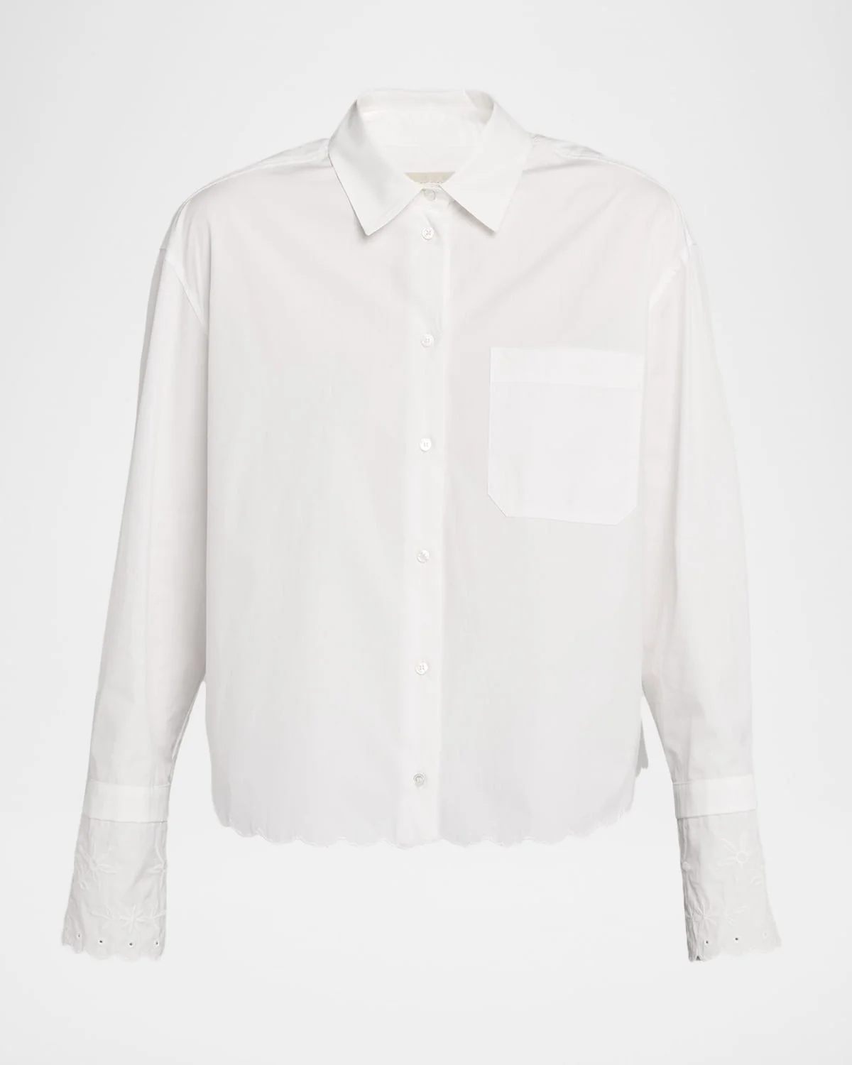 Cut from crisp cotton poplin, this Weekend Max Mara shirt is detailed with scalloped edges, tonal floral embroidery, and mother-of-pearl buttons Point collar; button front Long sleeves Button cuffs Chest patch pocket Box-pleated back yoke Straight fit Cotton Dry clean Imported