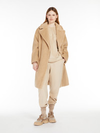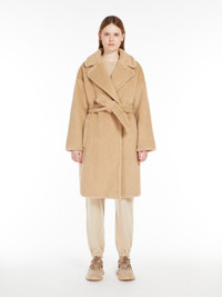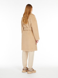 DETAILS Long robe coat in slub-look fluffy wool fabric featuring a lapel collar and long low set-in sleeves. The lined model boasts welt side pockets and a feminine silhouette-accentuating matching belt. Concealed press-stud fastening on the front. COMPOSITION AND CARE Jersey fabric 52% virgin wool, 26% polyester, 22% polyamide; lining 50% acetate, 50% viscose. Do not wash; do not bleach; do not tumble dry; do not iron; professionally dry clean perchloroethylene - mild process; do not wet clean. Distributed by Max Mara S.r.l., registered office in Reggio Emilia (Italy), Via Giulia Maramotti 4, 42124 (IT)