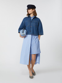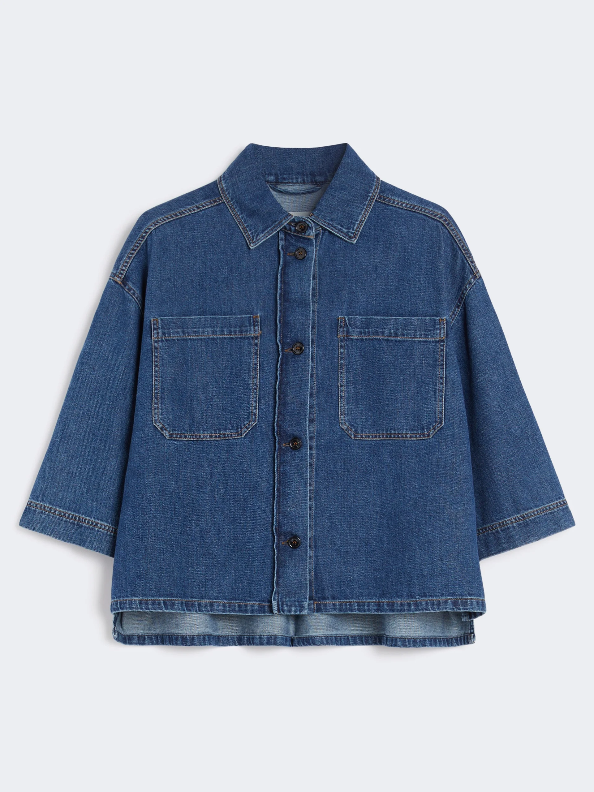 DETAILS Boxy-fit shirt featuring a cropped waist cut. Main fabric with cotton fibers, grown and processed according to organic farming systems "Nano Bubble" treatment technology and "Pumice stone free" treatment Shirt in garment-dyed pure cotton denim Low set-in 3/4 sleeves Visible button fastening on the front Patch breast pockets Darted yoke and pleat at the back Squared-off side slits COMPOSITION AND CARE 100% cotton. Machine wash cold delicate cycle; do not bleach; do not tumble dry; line drying in the shade; cool iron; professionally dry clean perchloroethylene - mild process.; wash the garment while it is fastened.; turn the articles inside out before washing.; take care when wearing light-coloured clothes or accessories because, with the heat of the body, the indigo fabric , may fade and stain. be careful while sitting on light coloured surfaces, especially if wet. wash garments separately and always turned inside out. hang the garment turned inside out by avoiding to expose it to direct sunlight. avoid removing isolated stains.; contains non-textile parts of animal origin. Distributed by Max Mara S.r.l., registered office in Reggio Emilia (Italy), Via Giulia Maramotti 4, 42124 (IT)