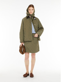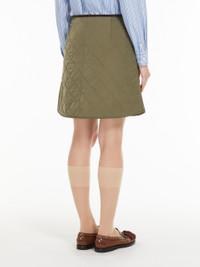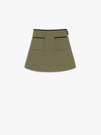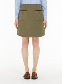 DETAILS Short skirt made of water-repellent taffeta, with a diamond-quilted pattern and padding in Luxepad Ultra Fine Insulating Technology, Camel-Silk Blend Edition. With a subtly flared silhouette, this style features snap-button patch pockets at the front and contrasting corduroy piping for added detail. Side zip fastening. COMPOSITION AND CARE Fabric 100% polyamide; with quilting in 49% polyester, 46% camelwool, 5% silk; lining 100% polyamide; - exclusive of decoration. Do not wash; do not bleach; do not tumble dry; cool iron; professionally dry clean hydrocarbons low moisture - mild process; do not wet clean.; do not iron the velvet ribbons.; protect zipper tongue and slide before cleaning.; protect buttons before washing. Distributed by Max Mara S.r.l., registered office in Reggio Emilia (Italy), Via Giulia Maramotti 4, 42124 (IT)