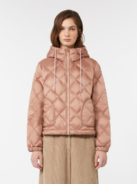 DETAILS Short, goose-down jacket with drawstring hood and all-over quilted diamond motif. Jacket in water-repellent tech fabric Boxy line Set-in sleeves with elasticated cuff Front zip closure Motif pockets with side entry Adjustable drawstring at the hem COMPOSITION AND CARE Fabric 100% polyester; lining 100% polyester; - exclusive of decoration; with quilting virgin down. Machine wash cold delicate cycle; do not bleach; do not tumble dry; line drying in the shade; cool iron; professionally dry clean perchloroethylene - mild process.; home washing: wash in lukewarm water with a gentle wash machine program. use liquid detergent with neuter ph. rinse several times until clear water is discharged. dry away from direct heating. squeeze and stretch to favor volume recovery.; wash the garment while it is fastened.; don’t iron the labels.; protect zipper tongue and slide before cleaning.; protect the ends stoppers and/or the cord ends before washing.; contains non-textile parts of animal origin. Distributed by Max Mara S.r.l., registered office in Reggio Emilia (Italy), Via Giulia Maramotti 4, 42124 (IT)