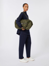 DETAILS Bomber-inspired extra-large Pasticcino Bag featuring two clasp-removable scoubidou shoulder straps, one short and one long one, for shoulder, handheld or crossbody use. - Bag in water-repellent technical nylon gabardine fabric - Padded with matching-fabric lining - Internal storage pocket with a branded label - Branded metal Weekend Max Mara sphere clasp - Size: 47 x 18 x 43 cm - Weight: 858 g COMPOSITION AND CARE Handbag in 100% polyamide; with quilting in 52% wool, 48% polyester. Do not wash; do not bleach; do not tumble dry; do not iron; do not dry clean; do not wet clean. Distributed by Max Mara S.r.l., registered office in Reggio Emilia (Italy), Via Giulia Maramotti 4, 42124 (IT) Collection: Weekend Max Mara Product code: 5511116406002 - WKAPESCHE