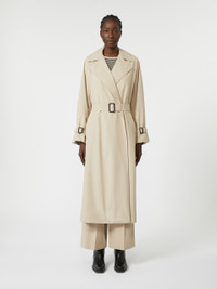 DETAILS Relaxed-fit long trench coat featuring a rain cape and central vent at the back. Water-repellent technical canvas trench coat Large lapel collar Raglan sleeves with adjustable cuff tab detail Double-breasted fastening with a matching waist belt Welt side pockets Weekend Max Mara logo print on the yoke lining. Half-lined model with technical tape detail COMPOSITION AND CARE Outer fabric 100% polyester; inner fabric 100% polyester; lining 100% cotton; sleeves lining 50% polyester, 50% viscose. Do not wash; do not bleach; do not tumble dry; cool iron; professionally dry clean hydrocarbons low moisture - mild process; do not wet clean.; remove the buckle before washing.; contains non-textile parts of animal origin. Distributed by Max Mara S.r.l., registered office in Reggio Emilia (Italy), Via Giulia Maramotti 4, 42124 (IT)