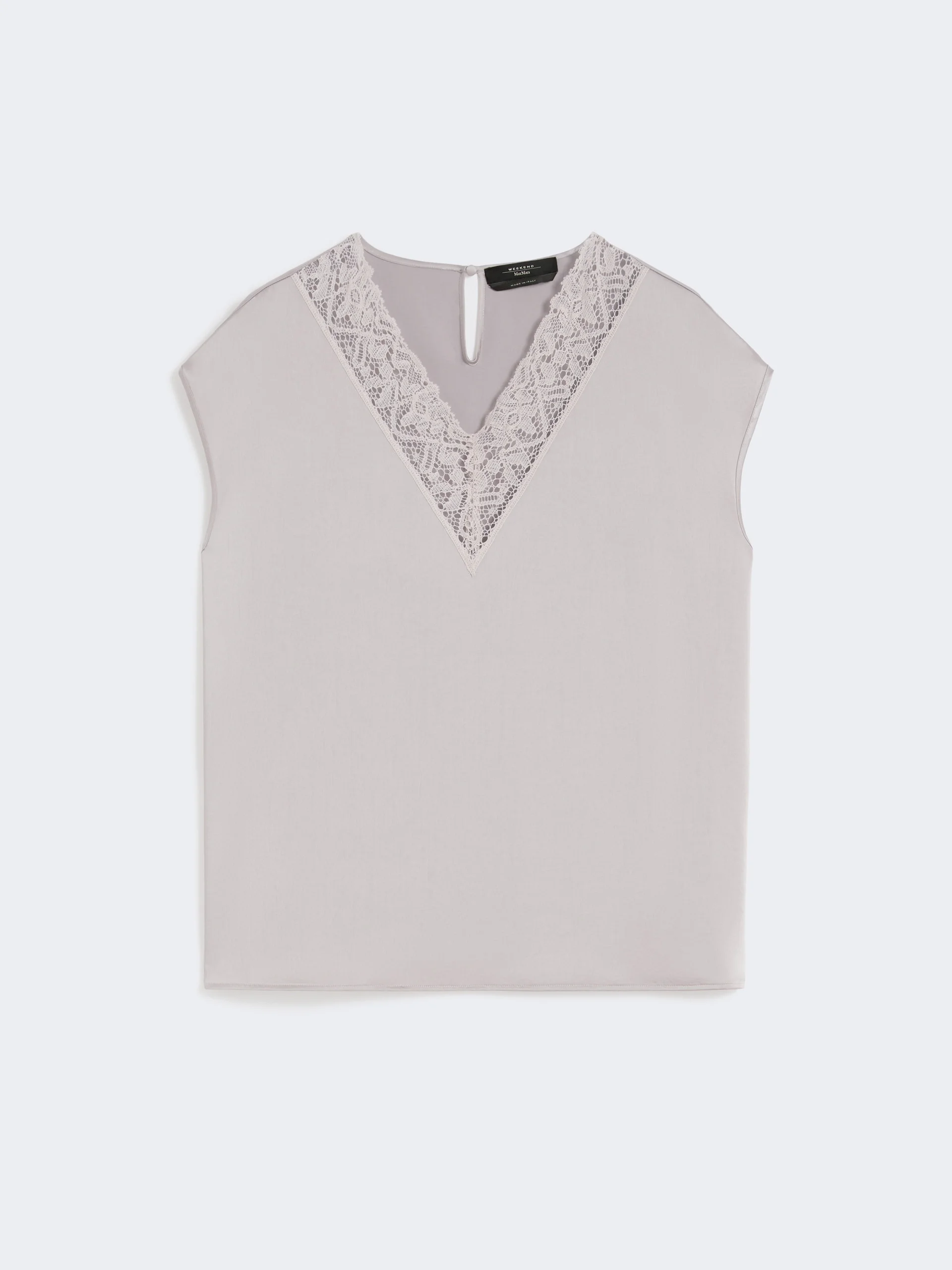 DETAILS Sleeveless top featuring a passementerie lace trim along the neckline. - Washed satin top - Fluid, feminine fit - V-neck and cap sleeves - Small button-fastening keyhole detail at the back - Side slits COMPOSITION AND CARE Fabric 100% polyester; lace in 100% polyester. Machine wash cold delicate cycle; do not bleach; do not tumble dry; line drying in the shade; cool iron; professionally dry clean perchloroethylene - mild process. Distributed by Max Mara S.r.l., registered office in Reggio Emilia (Italy), Via Giulia Maramotti 4, 42124 (IT) Collection: Weekend Max Mara Product code: 5161016106004 - WKDSTAFFA