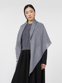 DETAILS Wide, enveloping shawl with fringed edges. Viscose and cashmere yarn shawl Customised with a matching butterfly logo embroidered on the hem Measurements: 130 x 135 c COMPOSITION AND CARE 80% viscose, 20% cashmere. Do not wash; do not bleach; do not tumble dry; cool iron; professionally dry clean perchloroethylene - mild process; do not wet clean. Distributed by Max Mara S.r.l., registered office in Reggio Emilia (Italy), Via Giulia Maramotti 4, 42124 (IT)