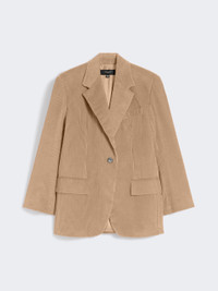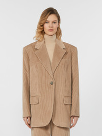 DETAILS Single-breasted, menswear-inspired blazer with a distinctive oversize volume. Nine-wale pure cotton corduroy blazer Straight lines and central slit at the back Lapel collar Set-in sleeves with button at the hem Single button fastening at the front Chest pocket and pockets with applied flap on the front Lined COMPOSITION AND CARE Fabric 100% cotton; lining 50% acetate, 50% viscose. Do not wash; do not bleach; do not tumble dry; cool iron; professionally dry clean perchloroethylene - mild process; do not wet clean.; wash the garment while it is fastened.; contains non-textile parts of animal origin. Distributed by Max Mara S.r.l., registered office in Reggio Emilia (Italy), Via Giulia Maramotti 4, 42124 (IT)