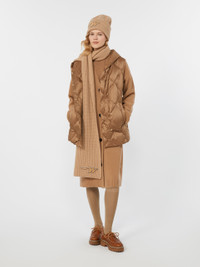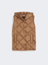 DETAILS Hooded gilet, customised with butterfly emblem on the back of the neck. Gilet in water-repellent tech fabric Regular fit Armhole with grosgrain ribbon trim Front fastening with snap buttons Welt pockets on the sides Goose-down padding COMPOSITION AND CARE Fabric 100% polyester; lining 100% polyester; - exclusive of decoration; with quilting virgin down. Machine wash cold delicate cycle; do not bleach; do not tumble dry; line drying in the shade; cool iron; professionally dry clean perchloroethylene - mild process.; home washing: wash in lukewarm water with a gentle wash machine program. use liquid detergent with neuter ph. rinse several times until clear water is discharged. dry away from direct heating. squeeze and stretch to favor volume recovery.; wash the garment while it is fastened.; don’t iron the labels.; contains non-textile parts of animal origin. Distributed by Max Mara S.r.l., registered office in Reggio Emilia (Italy), Via Giulia Maramotti 4, 42124 (IT)
