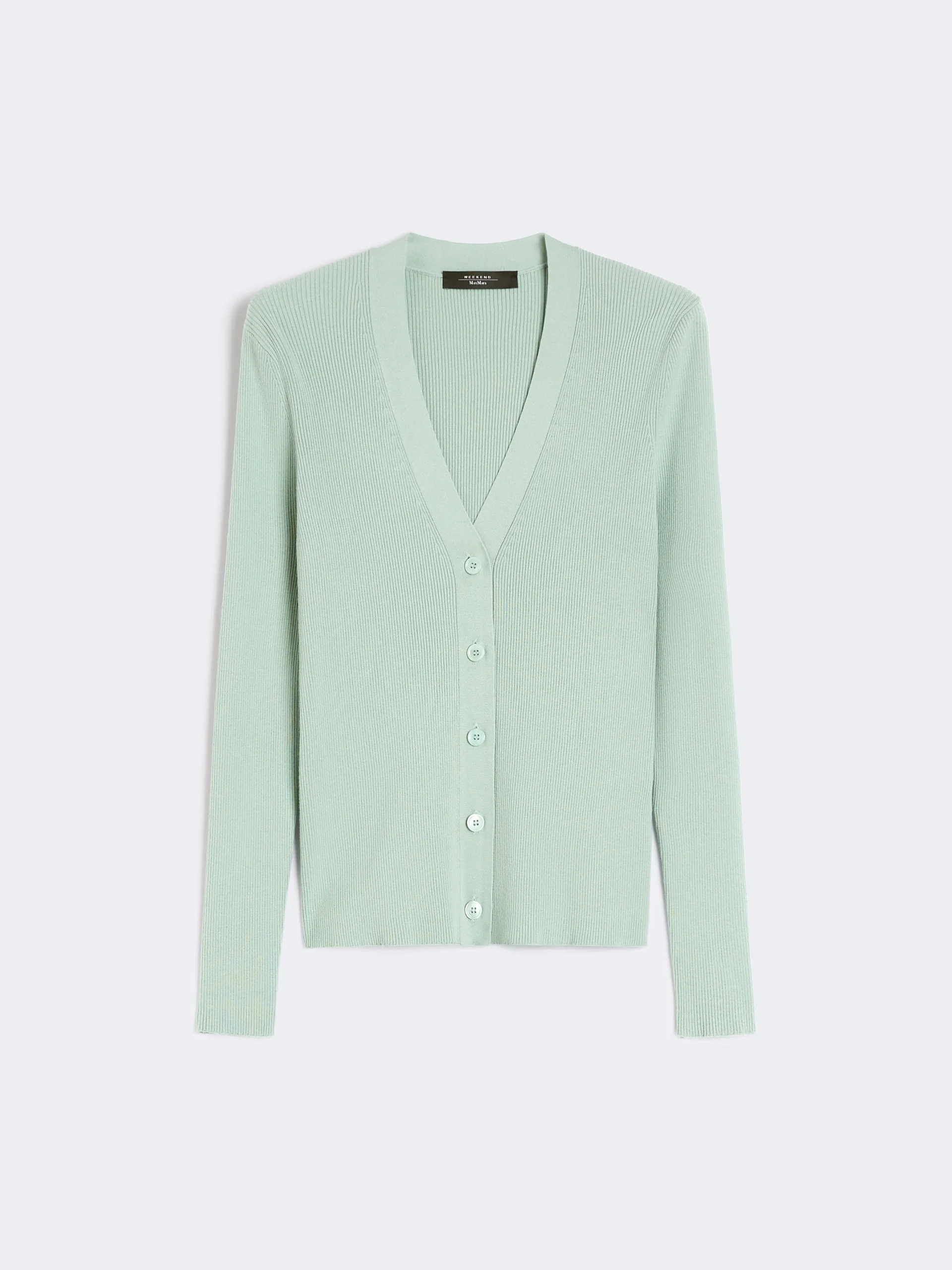 DETAILS Rib-knit cardigan with a regular length and fit. Stretch viscose yarn cardigan V-neck Long set-in sleeves Mother-of-pearl button fastening on the front COMPOSITION AND CARE 77% viscose, 23% polyester. Hand wash cold; do not bleach; do not tumble dry; flat drying in the shade; cool iron; professionally dry clean perchloroethylene - mild process; do not wet clean.; iron with a cloth between.; using neutral detergent. Distributed by Max Mara S.r.l., registered office in Reggio Emilia (Italy), Via Giulia Maramotti 4, 42124 (IT)