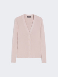 DETAILS Rib-knit cardigan with a regular length and fit. Stretch viscose yarn cardigan V-neck Long set-in sleeves Mother-of-pearl button fastening on the front COMPOSITION AND CARE 77% viscose, 23% polyester. Hand wash cold; do not bleach; do not tumble dry; flat drying in the shade; cool iron; professionally dry clean perchloroethylene - mild process; do not wet clean.; iron with a cloth between.; using neutral detergent. Distributed by Max Mara S.r.l., registered office in Reggio Emilia (Italy), Via Giulia Maramotti 4, 42124 (IT)