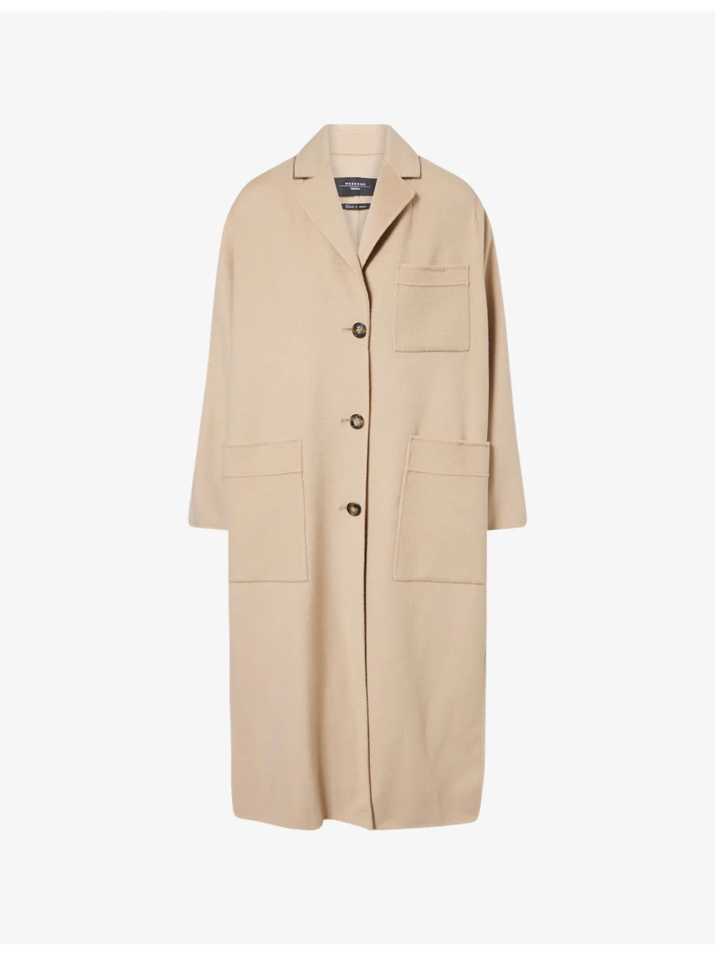 PRODUCT DETAILS - Weekend Max Mara wool-blend coat - 90% virgin wool, 10% polyamide; lining 52% polyester, 48% viscose - Exposed button fastening at front - Relaxed fit, single-breasted, notch lapels, long sleeves, three patch pockets at front, brushed - Dry clean - True to size - Size UK 8: length 47in / 120cm - Model is 5ft 10in/1.78m and wears a size UK 8 - Midweight, stretchy Ref: R04552924