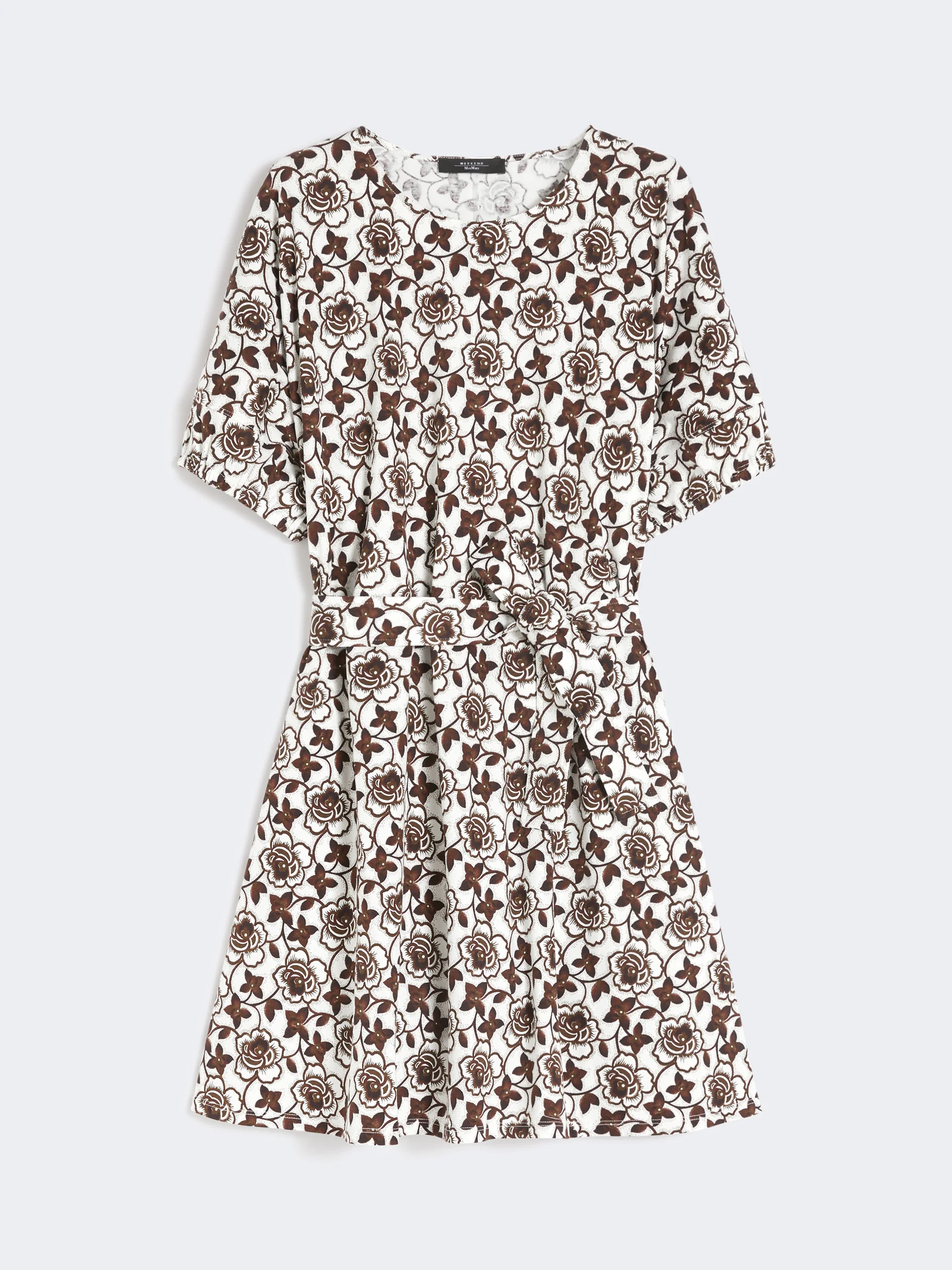 DETAILS Short dress featuring a waistline-accentuating matching belt. Dress in pure cotton interlock jersey fabric All-over printed pattern Flared fit Crew-neck Drop-shoulder short sleeves Gathered cuffs COMPOSITION AND CARE 100% cotton. Machine wash cold delicate cycle; do not bleach; do not tumble dry; flat drying in the shade; cool iron; professionally dry clean perchloroethylene - mild process; professional wet cleaning - very mild process.; iron with a cloth between.; using neutral detergent.; turn the articles inside out before washing.; to be ironed on reverse. Distributed by Max Mara S.r.l., registered office in Reggio Emilia (Italy), Via Giulia Maramotti 4, 42124 (IT)