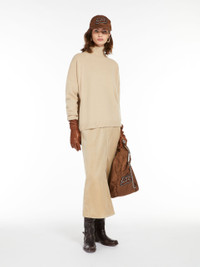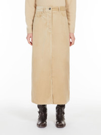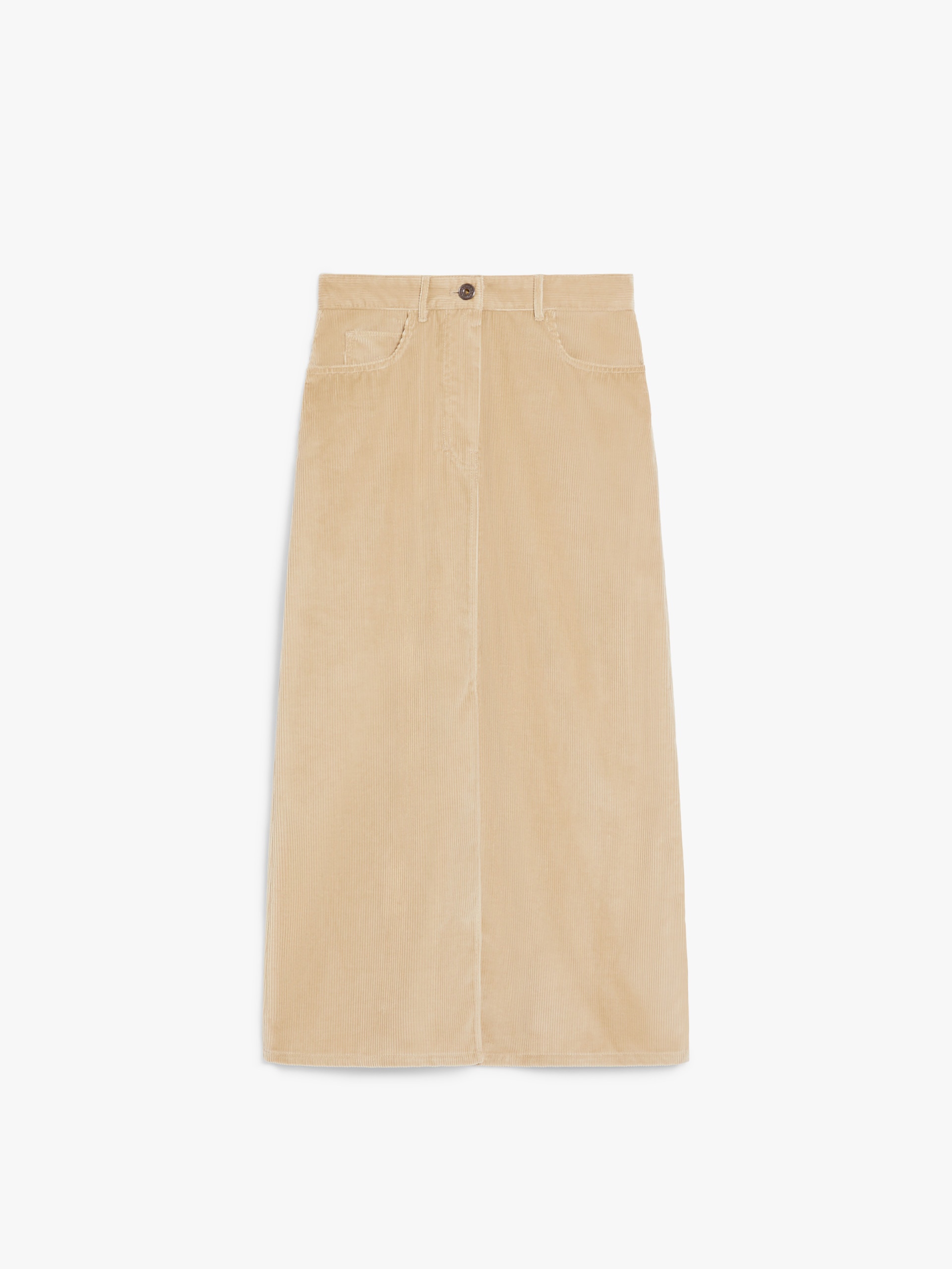 DETAILS Straight-fit long skirt in pure cotton corduroy (500 lines). The denim-style 5-pocket model boasts a yoke and patch pockets at the back. Central front slit and detail-highlighting topstitching. Fly-covered zip and tack button fastening on the front. COMPOSITION AND CARE 100% cotton. Do not wash; do not bleach; do not tumble dry; cool iron; professionally dry clean perchloroethylene - mild process; do not wet clean.; wash the garment while it is fastened.; turn the articles inside out before washing. Distributed by Max Mara S.r.l., registered office in Reggio Emilia (Italy), Via Giulia Maramotti 4, 42124 (IT)