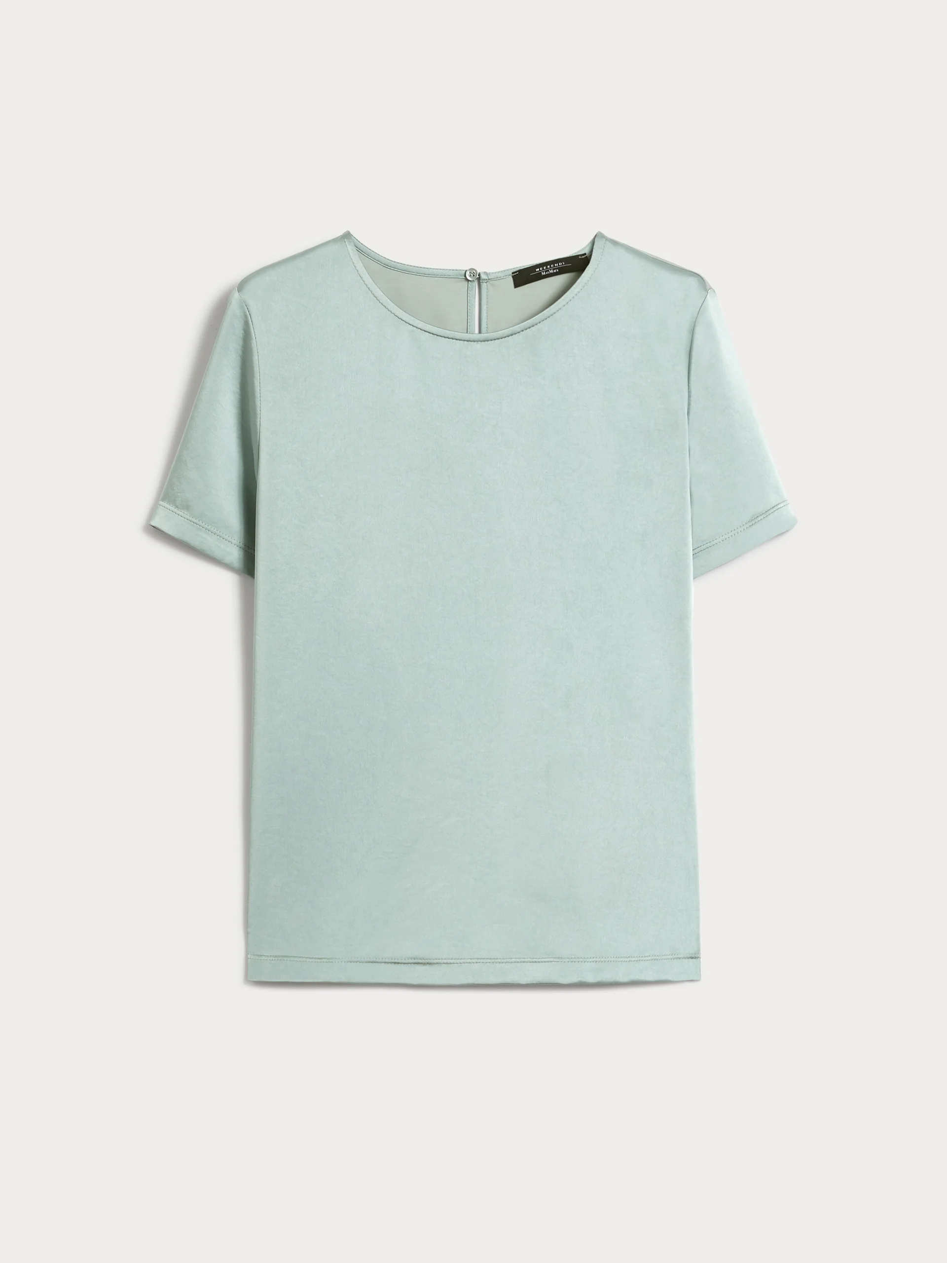 DETAILS Straight-fit T-shirt featuring contrasting-textured details. Satin T-shirt Back in lyocell and viscose interlock jersey fabric Crew-neck Short set-in sleeves Small button-fastening keyhole detail at the back COMPOSITION AND CARE Fabric 100% polyester; back 35% polyamide, 27% lyocell, 27% viscose, 11% elastane. Hand wash cold; do not bleach; do not tumble dry; drip line drying in the shade; cool iron; professionally dry clean perchloroethylene - mild process; do not wet clean.; iron with a cloth between.; using neutral detergent.; don’t rub.; turn the articles inside out before washing.; to be ironed on reverse. Distributed by Max Mara S.r.l., registered office in Reggio Emilia (Italy), Via Giulia Maramotti 4, 42124 (IT)