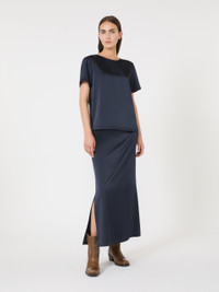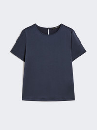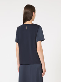 DETAILS Straight-fit T-shirt featuring contrasting-textured details. Satin T-shirt Back in lyocell and viscose interlock jersey fabric Crew-neck Short set-in sleeves Small button-fastening keyhole detail at the back COMPOSITION AND CARE Fabric 100% polyester; back 35% polyamide, 27% lyocell, 27% viscose, 11% elastane. Hand wash cold; do not bleach; do not tumble dry; drip line drying in the shade; cool iron; professionally dry clean perchloroethylene - mild process; do not wet clean.; iron with a cloth between.; using neutral detergent.; don’t rub.; turn the articles inside out before washing.; to be ironed on reverse. Distributed by Max Mara S.r.l., registered office in Reggio Emilia (Italy), Via Giulia Maramotti 4, 42124 (IT)