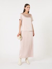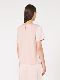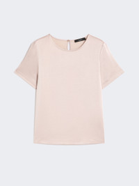 DETAILS Straight-fit T-shirt featuring contrasting-textured details. Satin T-shirt Back in lyocell and viscose interlock jersey fabric Crew-neck Short set-in sleeves Small button-fastening keyhole detail at the back COMPOSITION AND CARE Fabric 100% polyester; back 35% polyamide, 27% lyocell, 27% viscose, 11% elastane. Hand wash cold; do not bleach; do not tumble dry; drip line drying in the shade; cool iron; professionally dry clean perchloroethylene - mild process; do not wet clean.; iron with a cloth between.; using neutral detergent.; don’t rub.; turn the articles inside out before washing.; to be ironed on reverse. Distributed by Max Mara S.r.l., registered office in Reggio Emilia (Italy), Via Giulia Maramotti 4, 42124 (IT)